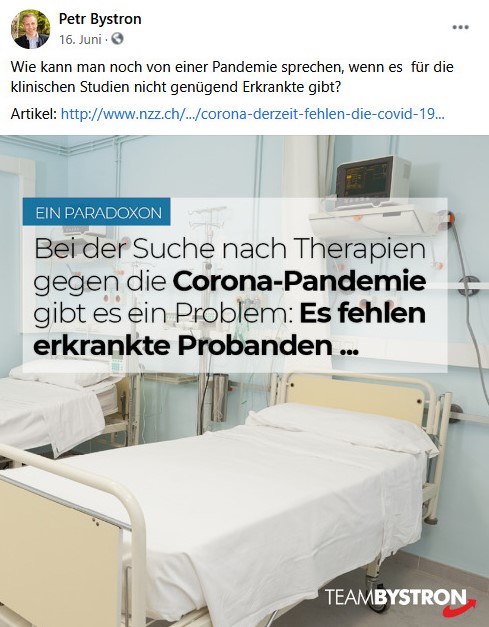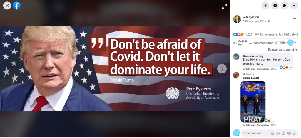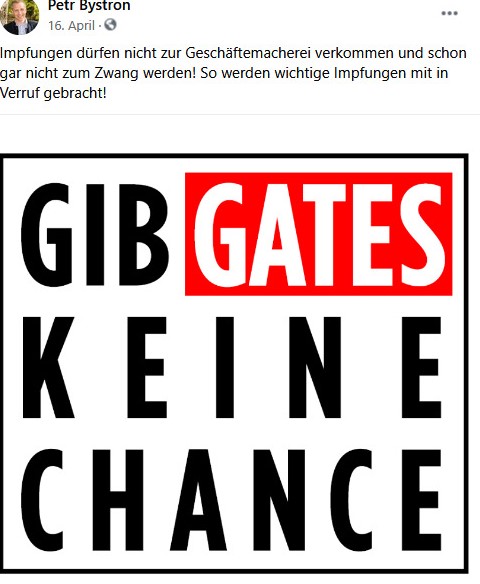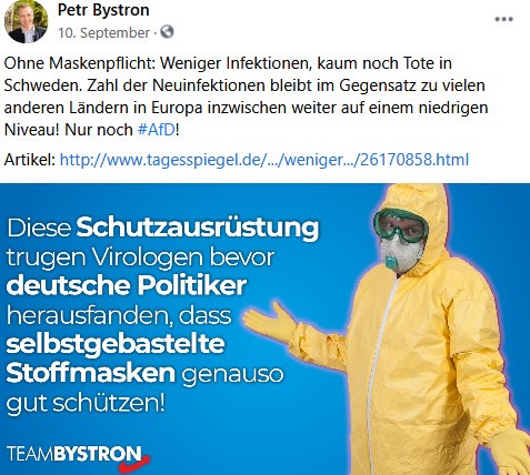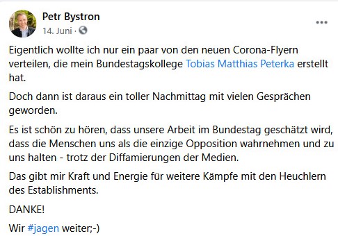 Die Facebook-Pinnwand der Seite Petr Bystrons wiederum ist geradezu überfüllt mit Verharmlosungen der Corona-Pandemie. Nur beispielhaft seien hier folgende vier Postings angefügt: