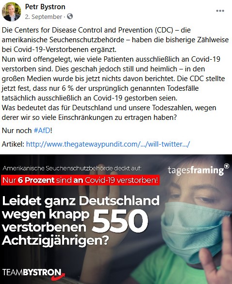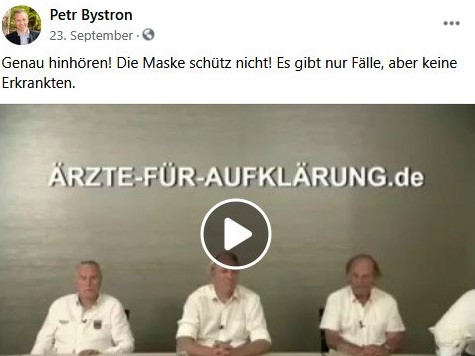 Aufgrund ihres nahezu vollständigen Verzichts auf Maßnahmen dient die schwedische Regierung den hiesigen Querdenker*innen als Vorbild. Bystron knüpft durch seine Affirmation des schwedischen Umgangs mit der Pandemie an unter Schwurbler*innen gängige Vorstellungen an. Eine weitere Übereinstimmung zwischen Bystron und den Corona-Rebell*innen besteht in der Rezeption der „Ärzte für Aufklärung“: