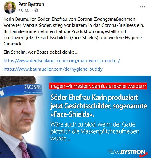 Die Frage, weshalb trotz scheinbarer Unnötigkeit die Regierung Söder sich für die Verwendung von Masken ausspricht, beantwortet Bystron mit folgender Verschwörungstheorie:
