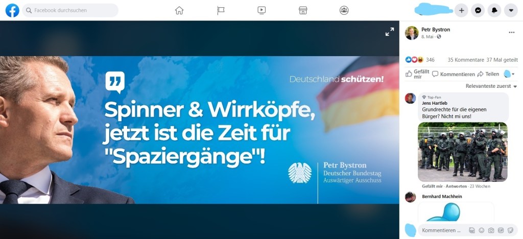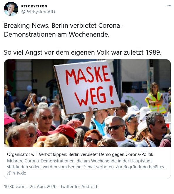 Mit dem Begriff „Spaziergänge“ knüpft Bystron an die Rhetorik von PEGIDA an, die ihren Demonstrationen auch immer als Spaziergänge bezeichnet hat. Offenbar sieht die AfD eine Kontinuität zwischen den rassistischen und flüchtlingsfeindlichen Protesten aus den Jahren 2015 und 2016 und den scheinbar Friede, Freiheit und Liebe propagierenden Corona-Rebell*innen von heute.