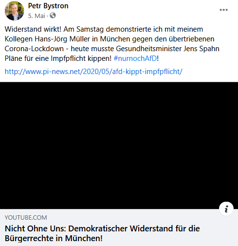 Und auch Bystron darf nicht fehlen: Gemeinsam mit dem AfD-MdB Hansjörg Müller tauchte er ebenfalls am 2. Mai auf. Damit waren mindestens vier AfD-Mitglieder in führenden Positionen auf Protestveranstaltungen der Münchner Corona-Rebell*innen zugegen, noch ehe sie an Fahrt aufgenommen haben.