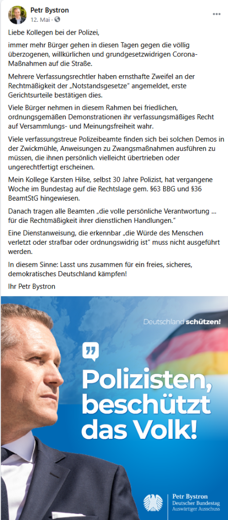 Doch zurück zur Corona-Pandemie. Genauso wie Walbrunn und die Rebell*innen lässt sich auch Bystron nicht nehmen, gegen die Regierungsmaßnahmen zu polemisieren wie im folgenden Beitrag:
