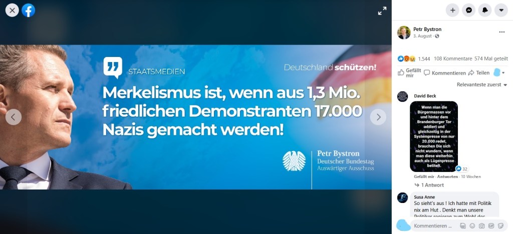 Die Zahl „1,3 Millionen“ stammt von den Veranstalter*innen und ist nichts als eine Lüge. Bystron übernimmt diese allerdings, solidarisiert sich dadurch mit den Querdenker*innen und verknüpft das darüber hinaus mit einer Polemik gegen Angela Merkel, wenn er die Kritik an dieser Lüge und die Beteiligung von Rechtsextremen als „Merkelismus“ bezeichnet. Eine derartige Anti-Merkel-Polemik konnten wir auch auf Münchner Demos der Corona-Rebell*innen beobachten und dokumentieren; darüber hinaus stellt sie eine ideologische Kontinuität zu den „Merkel-muss-weg“-Rufen aus PEGIDA-Zeiten dar.
