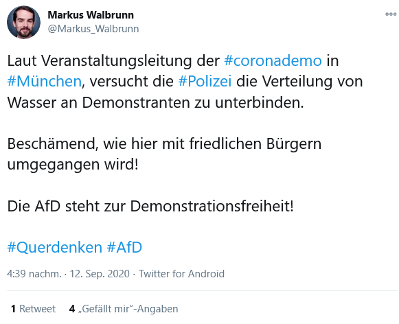 Zusammengefasst bestehen zwischen AfD und Corona-Rebell*innen absolute ideologische Übereinstimmungen. Hinsichtlich der Verharmlosung von Corona, der Polemik gegen DDR, Maskenpflicht und „Impfzwang“, dem Wittern von Verschwörungen um Bill Gates, der Verwendung von Quellen wie „Ärzte für Aufklärung“ und der affirmativen Bezugnahme auf Donald Trump und Schweden passt kein Blatt Papier zwischen den Münchner Querdenker*innen, wie sie sich auf den hiesigen Demos präsentierten, und profilierten AfD-Mitgliedern aus der Landeshauptstadt wie die Bundestags- bzw. Stadtratsmitglieder Petr Bystron, Wolfgang Wiehle und Markus Walbrunn. Dabei ist diese Eintracht nicht selbstverständlich. Wirft man den Blick auf Postings zu Beginn der Pandemie, hört man von Wiehle und Bystron ganz andere Töne: