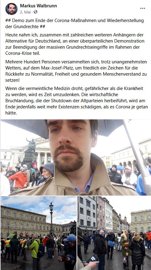 Übrigens war Wiehle bei seinen Auftritten nicht allein. Auch schon am 2. Mai war Walbrunn bei den Kundgebungen zugegen, wie er selbst mitteilt: