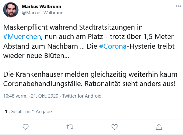 Die Behauptung, Krankenhäuser würden keine Fälle melden, darf man gerade zu dem Zeitpunkt problemlos als Fake News bezeichnen. Walbrunn nutzt diese Lüge, um von einer „Corona-Hysterie“ zu sprechen und gegen die Maskenpflicht zu polemisieren. Die Agitation gegen die Maskenpflich findet sich auf unzähligen Plakaten der Münchner Corona-Rebell*innen, die wir in unseren Recherche-Texten dokumentiert haben. Zu den Verschwörungstheorien um Rothschild und Soros gesellt sich folglich eine weitere ideologische Überschneidung von AfD und Corona-Rebell*innen.