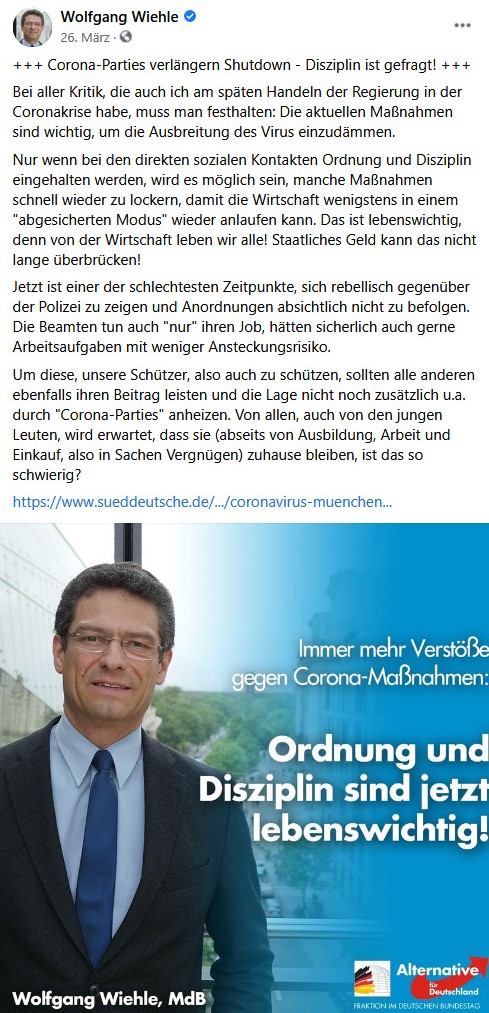Im Mittelpunkt der folgenden Ausführungen stehen Veröffentlichungen von drei profilierten Mitglieder der Münchner AfD auf Facebook, Twitter oder offiziellen Seiten. Bei diesen handelt es sich um Petr Bystron (Vorsitzender des Kreisverbandes München Nord, Mitglied des Bundestages und ehemaliger Landesvorsitzender der AfD Bayern), Wolfgang Wiehle (Mitglied des Bundestages und Bürgermeisterkandidat der AfD München für die hiesige Kommunalwahl 2020) und Markus Walbrunn (Vorsitzender des KV München West/Mitte und Mitglied des Stadtrates). Da sie in ihre jeweiligen Positionen von Mehrheiten der Münchner AfD hineingewählt worden sind, darf man davon ausgehen, dass ihre Ansichen in der Partei hegemonial sind, sofern kein parteiinterner Widerspruch sichtbar wird. Und um kurz zu spoilern: Auf Widerspruch sind wir nirgenwo gestoßen. Vielmehr üben sich alle drei in harmonischer Eintracht, wenn es um die Pandemie geht.