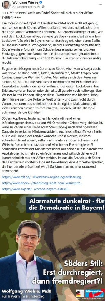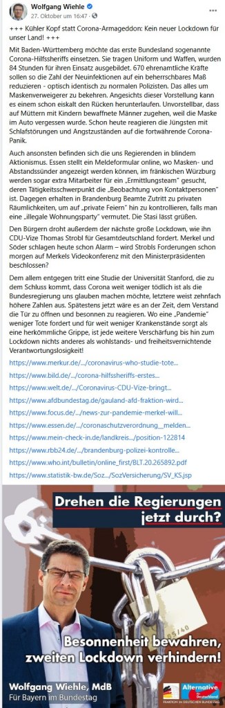 Wie Walbrunn spricht auch Wiehle von „Hysterie“ und behauptet – noch am 27. Oktober! – die Corona-Pandemie sei weniger gefährlich als eine Grippe. Ähnlich wie die Corona-Rebell*innen auf unzähligen Plakaten bemüht auch er die DDR als dystopisches Modell, vergleicht die Regierungsmaßnahmen mit dem Vorgehen der Stasi und warnt vor einem Obrigkeitsstaat. Dazu passt auch die affirmative Bezugnahme auf die gute alte Zeit unter Franz Josef Strauß, auf den sich einige Münchner Corona-Rebell*innen auch schon positiv berufen haben.