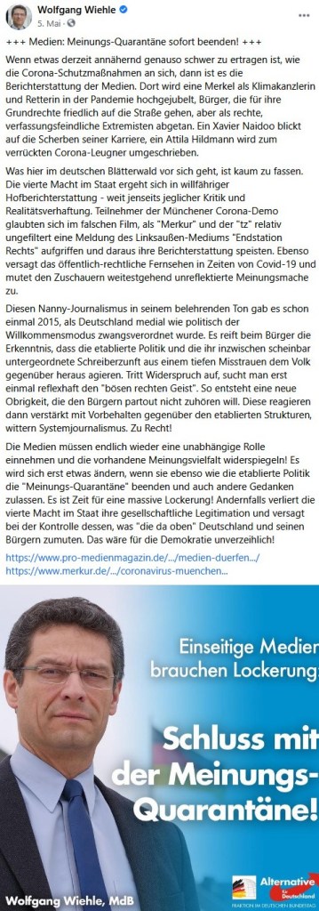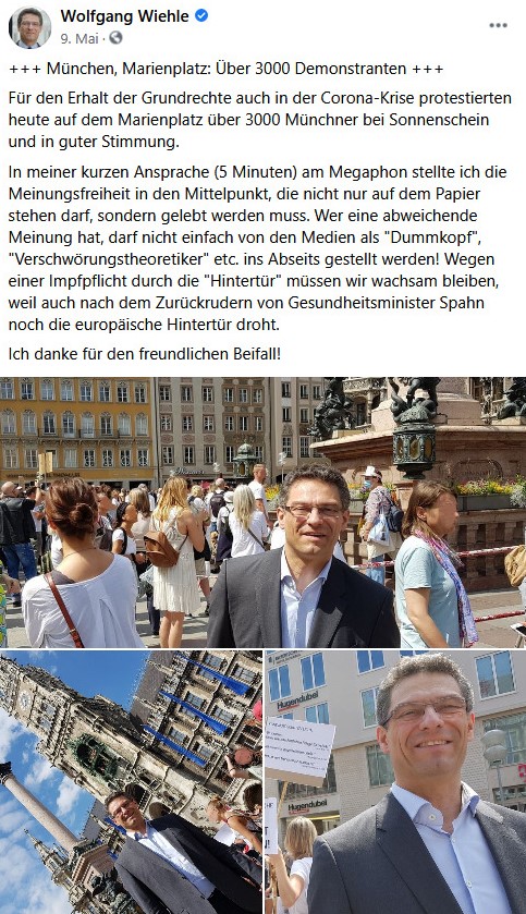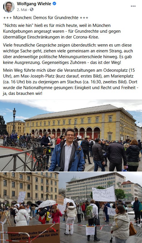 Den Durchbruch mit Tausenden Teilnehmer*innen hatten die Querdenker*innen erst am 9. Mai. Dass ein so profiliertes Mitglied der Münchner AfD wie Wiehle – immerhin MdB und ehemaliger Bürgermeisterkandidat – bereits zu dem Zeitpunkt auf sie zugegangen ist, demonstriert das große Interesse, das die AfD von Anfang an an den Münchner Rebell*innen hatte. Und aus Wiehles Beitrag geht auch der gegenseitig positive Eindruck deutlich hervor. Offenbar war man von Anfang an auf einer Wellenlänge. Eine Woche später durfte Wiehle bereits einen Redebeitrag halten, der bei den Anwesenden offenbar gut angekommen ist: