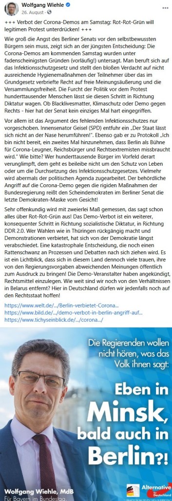 Aus der Durchsicht verschiedener Einträge von Petr Bystron, Wolfgang Wiehle und Markus Walbrunn geht hervor, dass sie in nahezu allen Aspekten ideologisch mit den Corona-Rebell*innen übereinstimmen: Von der Verharmlosung der Pandemie über die Polemik gegen Maskenpflicht, Impfzwang, Angela Merkel und die DDR, Verschwörungstheorien zu Bill Gates bishin zu Sympathiebekundungen für Attila Hildmann, Xavier Naidoo und Donald Trump. Darüber hinaus bestehen auch direkte persönliche Verbindungen zu den Rebell*innen. Alle drei waren bisweilen mehrfach auf ihren Demonstrationen zugegen; Wiehle hielt sogar einen Redebeitrag, während Walbrunn am 29. August direkt nach Berlin fuhr. Immer wieder inszenierten sie sich als politisches Sprachrohr der Querdenker*innen, solidarisierten sich offen mit ihnen gegen Kritik und riefen die Anhängerschaft zur Teilnahme auf. Umgekehrt stießen sie bei den Teilnehmenden immer wieder auf Zustimmung und Beifall. Zu berücksichtigen ist die hohe Stellung, die alle drei in der Münchner AfD genießen: Bystron und Wiehle sind Bundestagsmitglieder, letzterer war sogar Bürgermeisterkandidat der AfD München, während Walbrunn im Münchner Stadtrat sitzt; er und Bystron sind darüber hinaus Vorsitzende der Kreisverbände München West/Mitte bzw. Nord. Sie sind daher als profilierte Vertreter der Münchner AfD einzuschätzen. Daher besteht kein Zweifel daran, dass die AfD als parlamentarischer Arm der Corona-Rebell*innen fungiert – so wie sie es dereinst einer für PEGIDA und deren Hetze gegen Flüchtlinge war.
