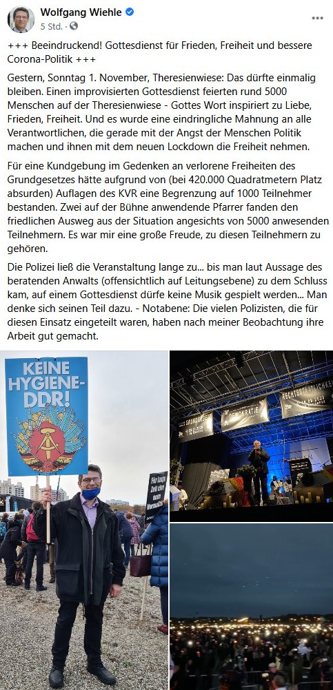 Und beim letzten Aufmarsch der Querdenker*innen am 1. November fand sich Wolfgang Wiehle ein, nicht ohne antikommunistische Hetze und realitätsfremder Übertreibung der Teilnehmer*innenzahl: