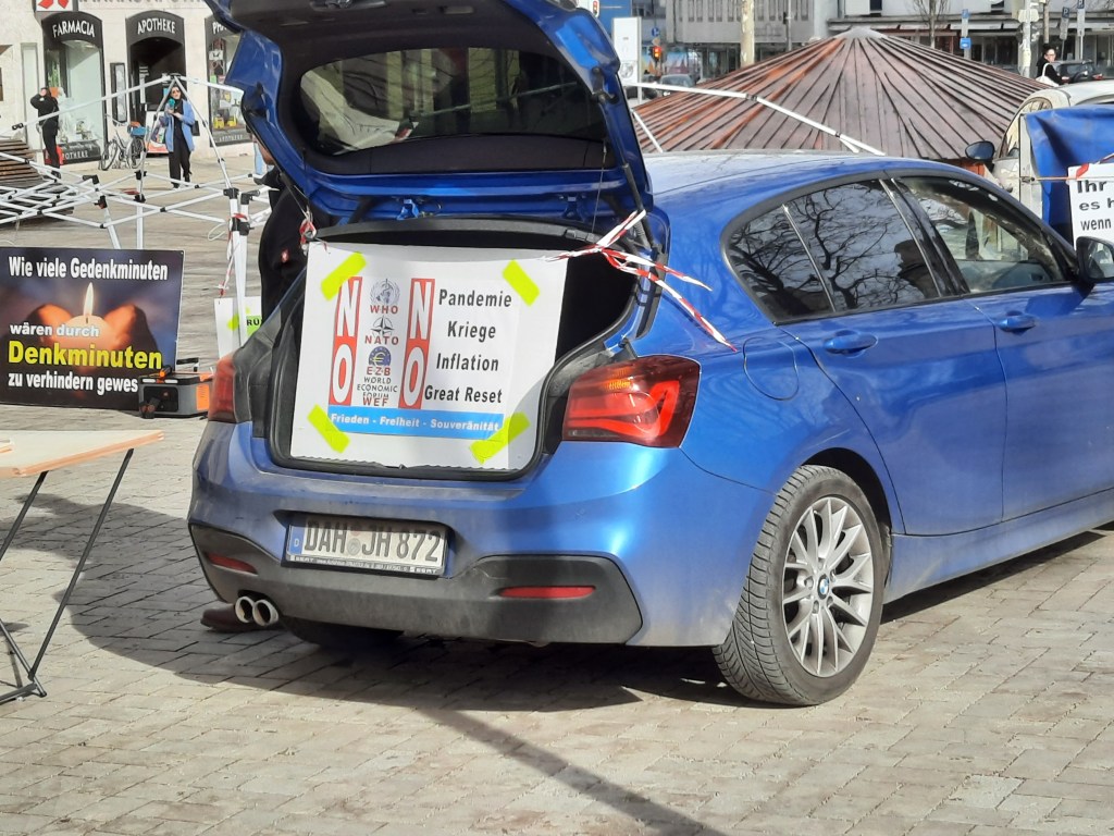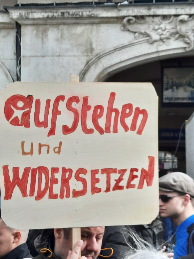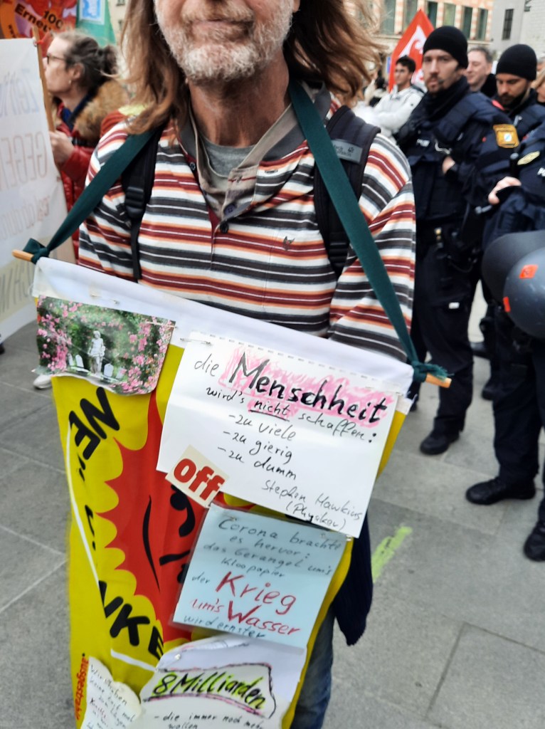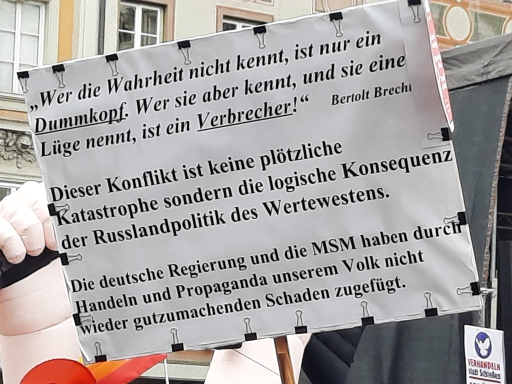 Der Inhalt des rätselhaften Plakats, das von Gott spricht (und wohl auf Hitler anspielt), wurde übrigens auch auf der Kundgebung von „München steht auf“ am Königsplatz gesichtet. Offensichtlich ist es nicht dasselbe Exemplar – aber der Spruch ist identisch. Hier zeigen sich weitere Verbindungen zwischen dem Fußvolk von Querdenken und Friedensbewegung.