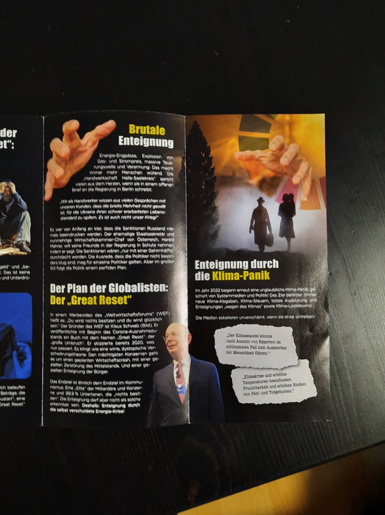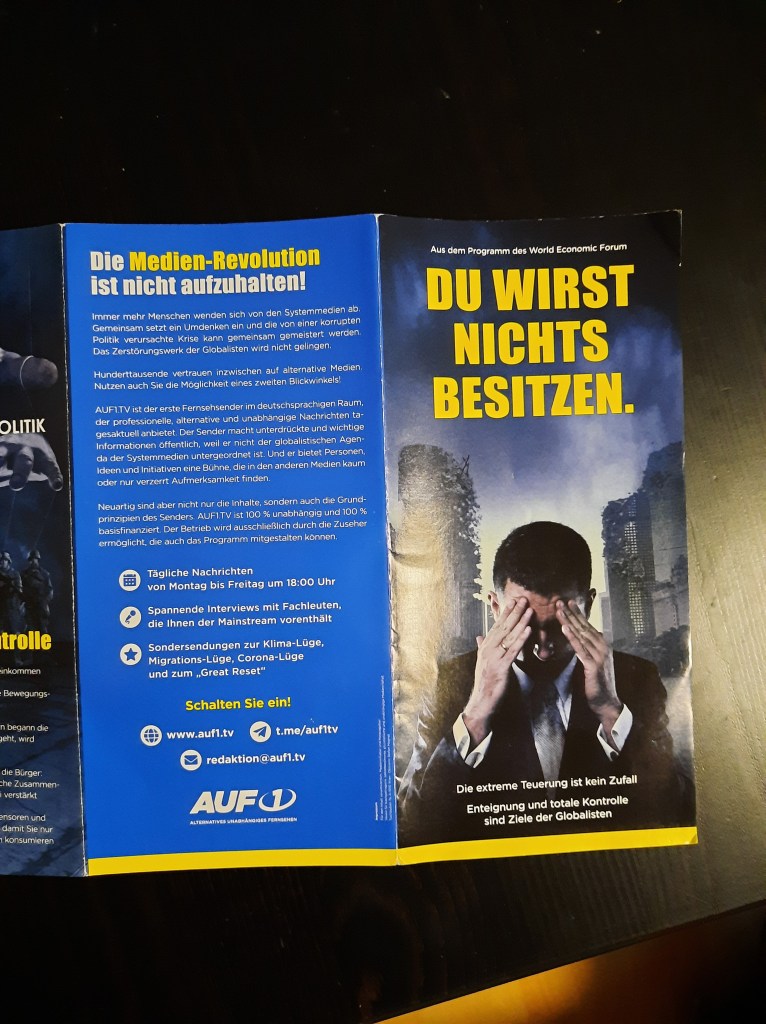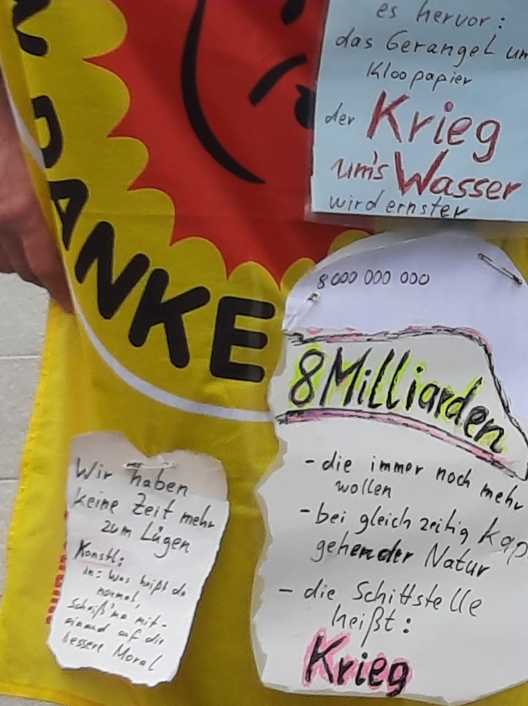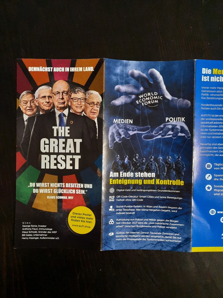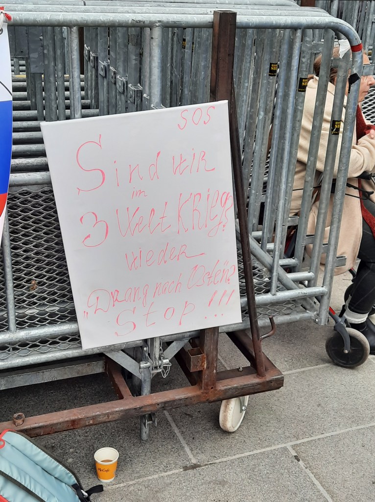 Der Inhalt des rätselhaften Plakats, das von Gott spricht (und wohl auf Hitler anspielt), wurde übrigens auch auf der Kundgebung von „München steht auf“ am Königsplatz gesichtet. Offensichtlich ist es nicht dasselbe Exemplar – aber der Spruch ist identisch. Hier zeigen sich weitere Verbindungen zwischen dem Fußvolk von Querdenken und Friedensbewegung.