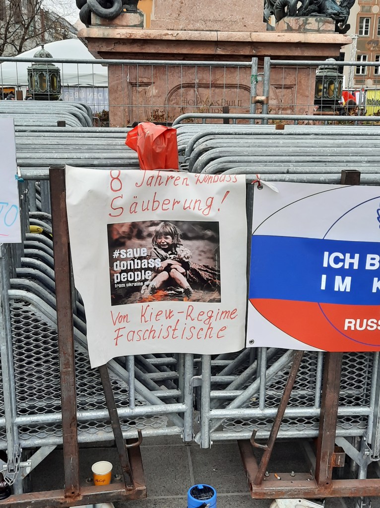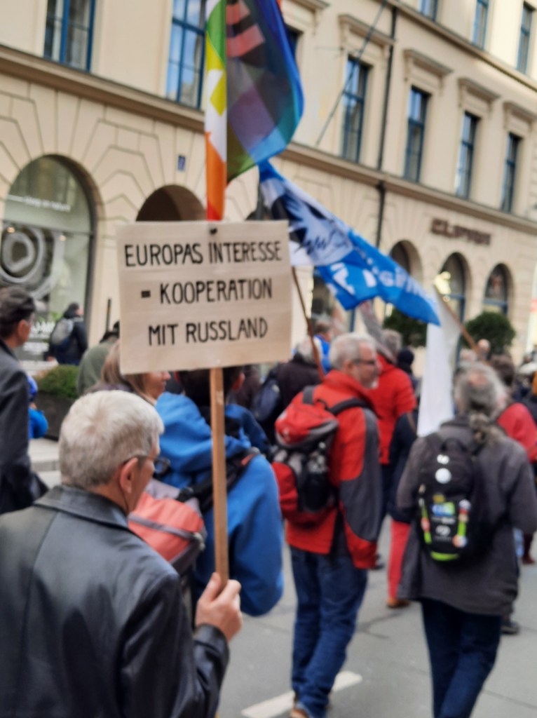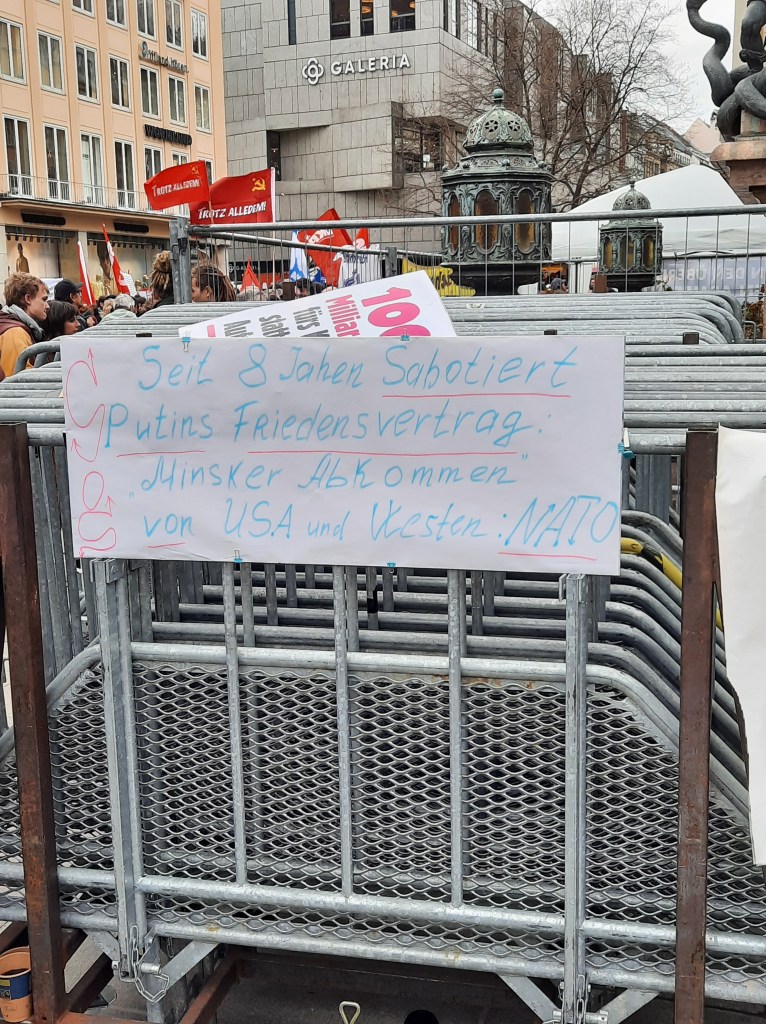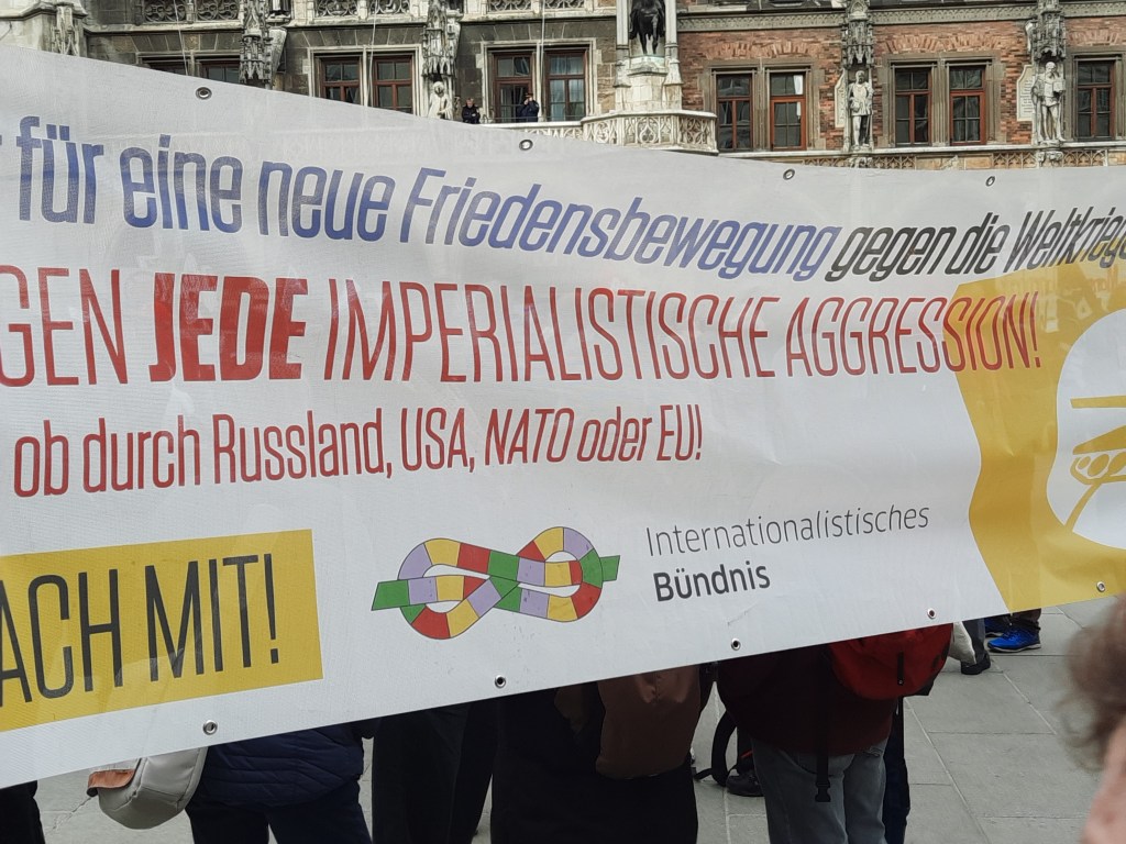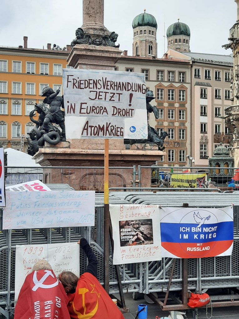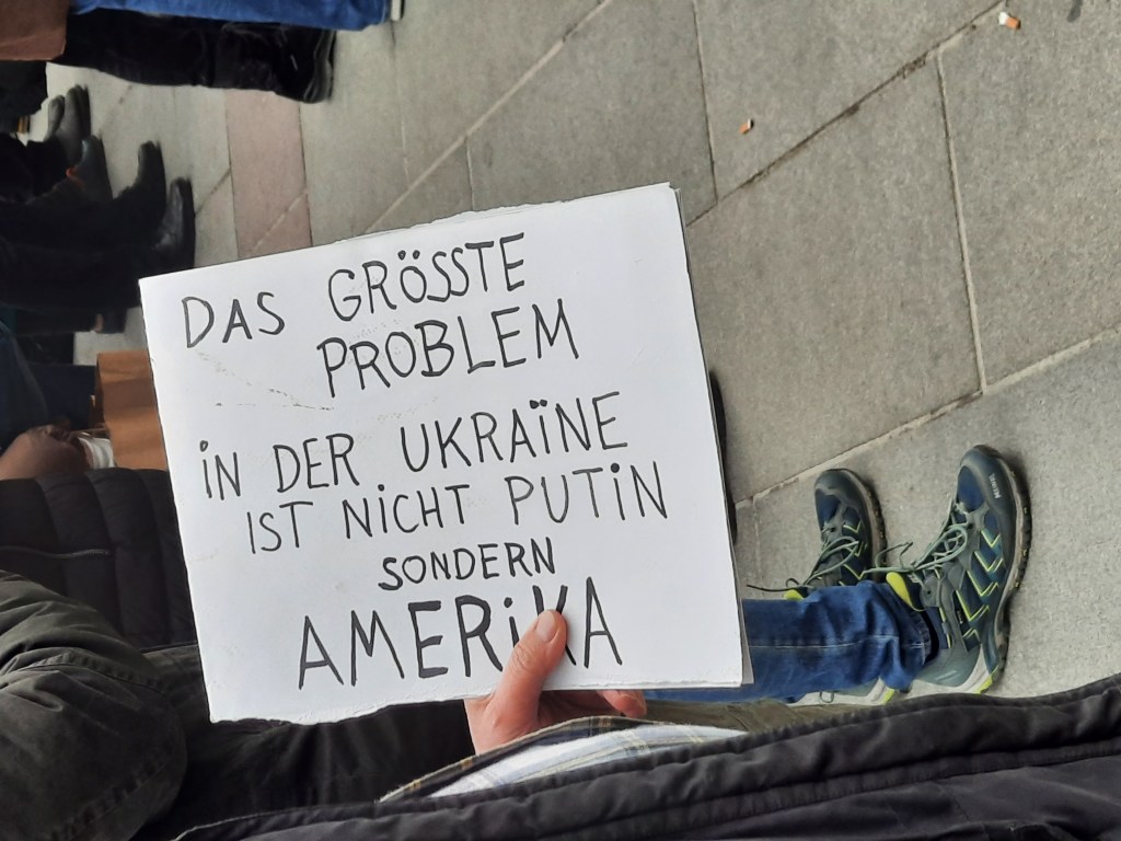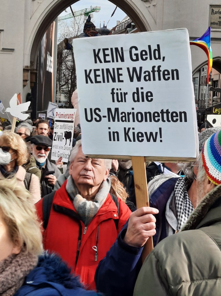 Wir präsentieren hier eine kleine Bilderstrecke, die die Präsenz von Putin-Verharmlosung, absurden Antiamerikanismus und Verschwörungsideologeme für die linke Anti-Siko-Demo belegen soll. Dass diese bei den Kundgebungen von AfD und „München steht auf“ vorhanden sind, versteht sich von selbst und bedarf unserer Ansicht nach keiner weiteren Belege mehr. Im Anschluss an die Bilder von der linken Demo zeigen wir nur einzelne Aufnahmen von der Kundgebung am Königsplatz, die Antisemitismus zeigen und einen engeren Zusammenhang zu den linken Protesten nahelegen. Wir begrüßen die Distanzierung des linken Aktionsbündnisses vom Querdenken und Konsorten und die sichtbare Abwesenheit der „Freien Linken“, doch hat die Friedensbewegung noch viel zu tun, um sich ihres Antisemitismusproblems zu entledigen. Vergessen wir nicht, dass sie systematisch die Politik des russischen autokratischen Regimes verharmlost, das qua Medien wie RT und Unterstützung rechter Parteien wie die AfD auch zur Verbreitung antisemitischer Inhalte beiträgt.