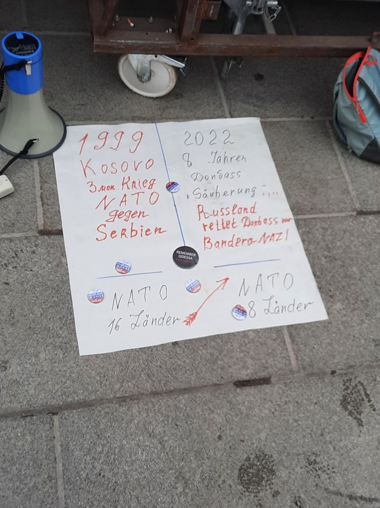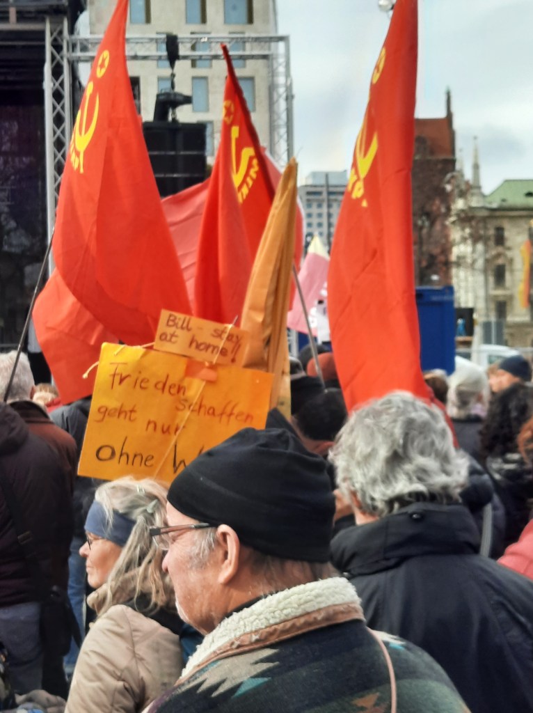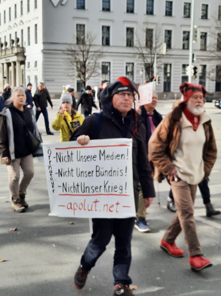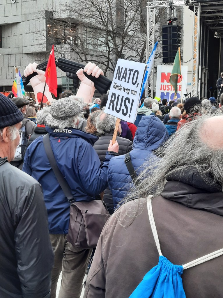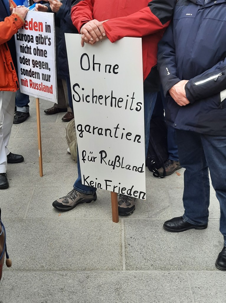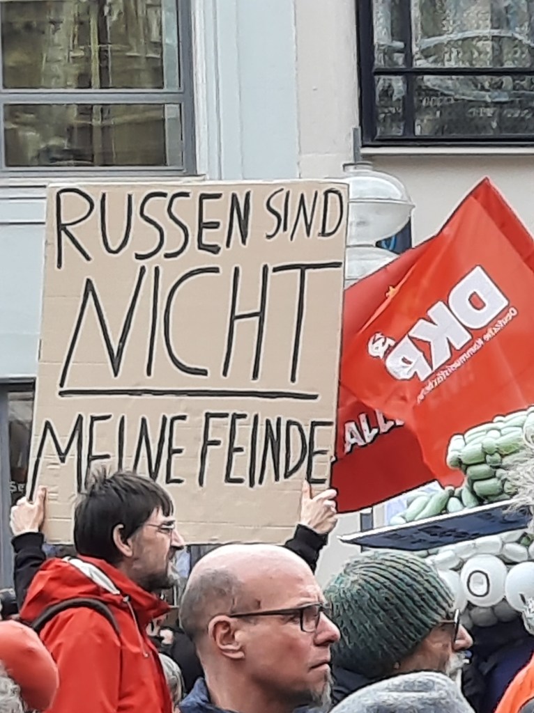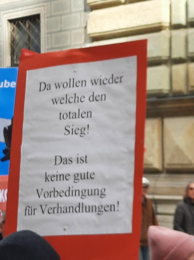 Wir präsentieren hier eine kleine Bilderstrecke, die die Präsenz von Putin-Verharmlosung, absurden Antiamerikanismus und Verschwörungsideologeme für die linke Anti-Siko-Demo belegen soll. Dass diese bei den Kundgebungen von AfD und „München steht auf“ vorhanden sind, versteht sich von selbst und bedarf unserer Ansicht nach keiner weiteren Belege mehr. Im Anschluss an die Bilder von der linken Demo zeigen wir nur einzelne Aufnahmen von der Kundgebung am Königsplatz, die Antisemitismus zeigen und einen engeren Zusammenhang zu den linken Protesten nahelegen. Wir begrüßen die Distanzierung des linken Aktionsbündnisses vom Querdenken und Konsorten und die sichtbare Abwesenheit der „Freien Linken“, doch hat die Friedensbewegung noch viel zu tun, um sich ihres Antisemitismusproblems zu entledigen. Vergessen wir nicht, dass sie systematisch die Politik des russischen autokratischen Regimes verharmlost, das qua Medien wie RT und Unterstützung rechter Parteien wie die AfD auch zur Verbreitung antisemitischer Inhalte beiträgt.