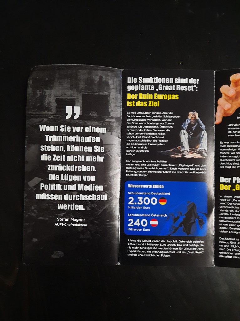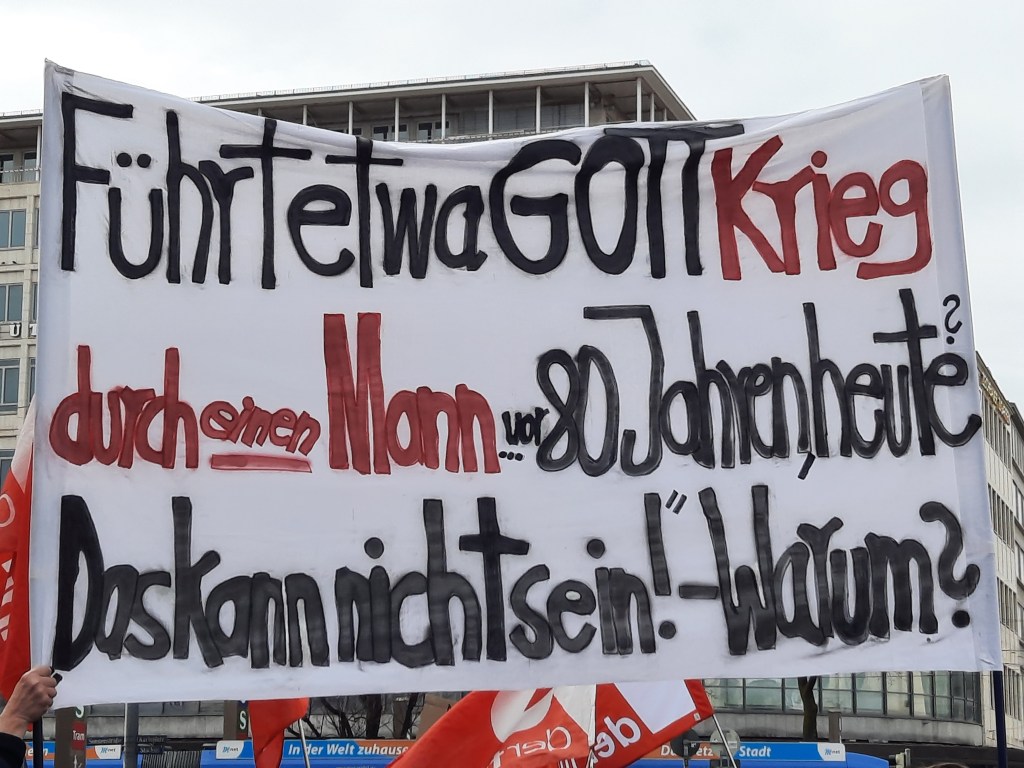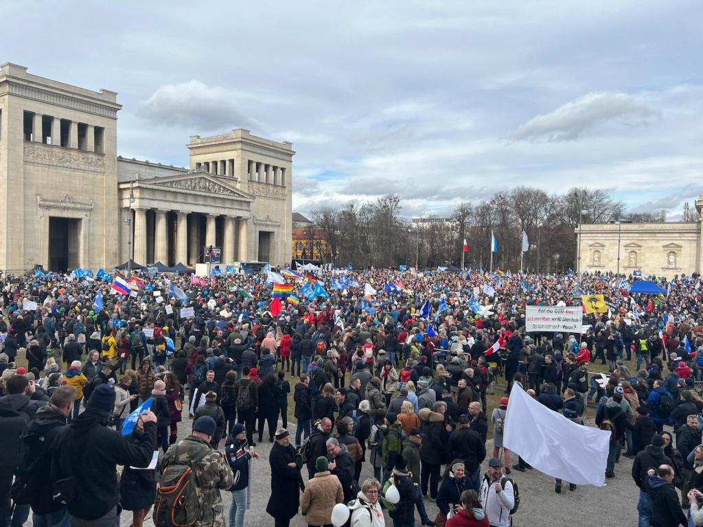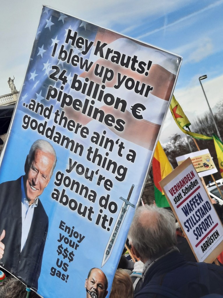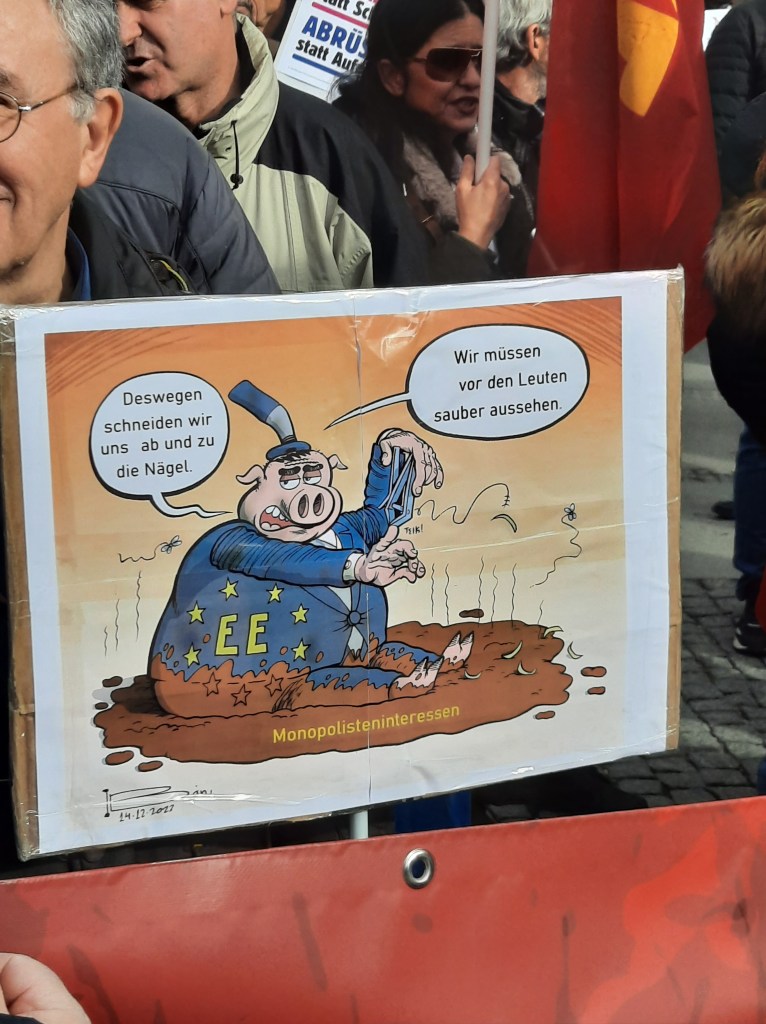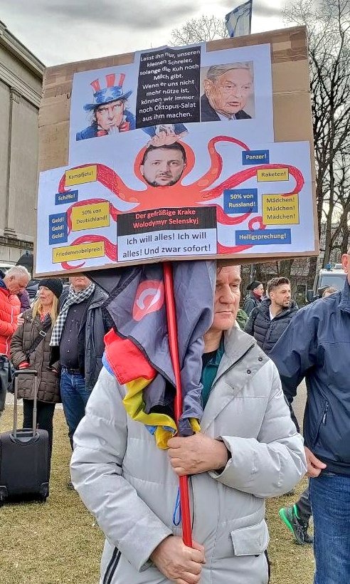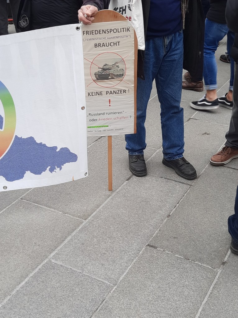 Wir präsentieren hier eine kleine Bilderstrecke, die die Präsenz von Putin-Verharmlosung, absurden Antiamerikanismus und Verschwörungsideologeme für die linke Anti-Siko-Demo belegen soll. Dass diese bei den Kundgebungen von AfD und „München steht auf“ vorhanden sind, versteht sich von selbst und bedarf unserer Ansicht nach keiner weiteren Belege mehr. Im Anschluss an die Bilder von der linken Demo zeigen wir nur einzelne Aufnahmen von der Kundgebung am Königsplatz, die Antisemitismus zeigen und einen engeren Zusammenhang zu den linken Protesten nahelegen. Wir begrüßen die Distanzierung des linken Aktionsbündnisses vom Querdenken und Konsorten und die sichtbare Abwesenheit der „Freien Linken“, doch hat die Friedensbewegung noch viel zu tun, um sich ihres Antisemitismusproblems zu entledigen. Vergessen wir nicht, dass sie systematisch die Politik des russischen autokratischen Regimes verharmlost, das qua Medien wie RT und Unterstützung rechter Parteien wie die AfD auch zur Verbreitung antisemitischer Inhalte beiträgt.