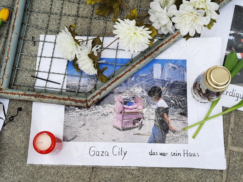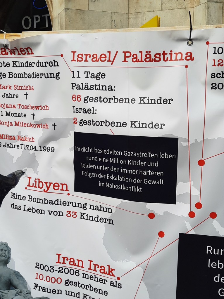 Keine Friedensdemo ohne Israel-Bashing! Die antisemitische Parole „Kindermörder Israel“ wird hier zumindest sehr nahegelegt, wenn der Tod israelischer und palästinensischer Kinder gegeneinander aufgerechnet wird und anschließend Bilder verstorbener palästinensischer Jugendlicher präsentiert werden. Israel wird zum alleinigen Aggressor im Nahostkonflikt stilisiert. Bedenkt man, wie äquidistant die Haltung zu einem echten militärischen Agressor wie Putin ist, lässt sich diese Dämonisierung des einzigen jüdischen Staates nur noch als Doppelstandard bezeichnen.