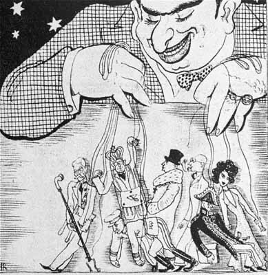 Es handelt sich um eine Karikatur aus der NS-Zeit. Hier ist ein stereotypischer „Jude“ in antisemitischer Vorstellung zu sehen, die eine Hakennase hat und Marionetten kontrolliert. Dieselbe Bildsprache benutzte auch Ska-P auf ihrem Cover.