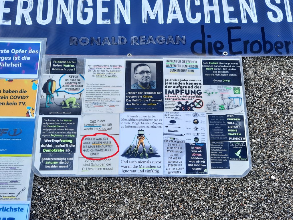 So viel zu den Redebeiträgen. Auf dem Königsplatz, wo die Demo startete und endete, befanden sich mehrere Infostände, auf denen einschlägiges verschwörungsideologisches, christlich-fundamentalistisches und rechtsextremes Material verteilt wurde: