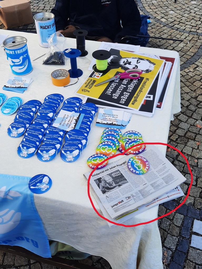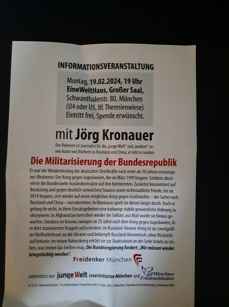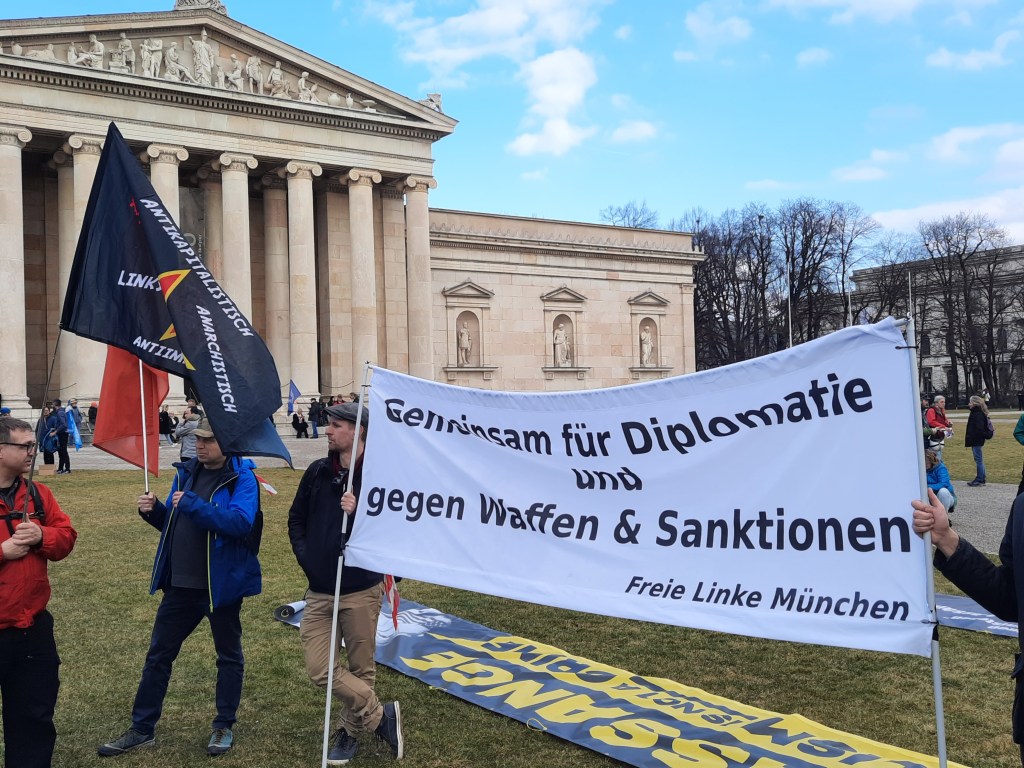 Die Leserinitiative München der Jungen Welt verteilte vor Ort sogar Flyer, die eine baldige Veranstaltung mit dem Münchner Friedensbündnis und dem Freidenkerverband München – beides Organisationen, die zur traditionellen Anti-Siko-Demo aufriefen[3] – bewerben: