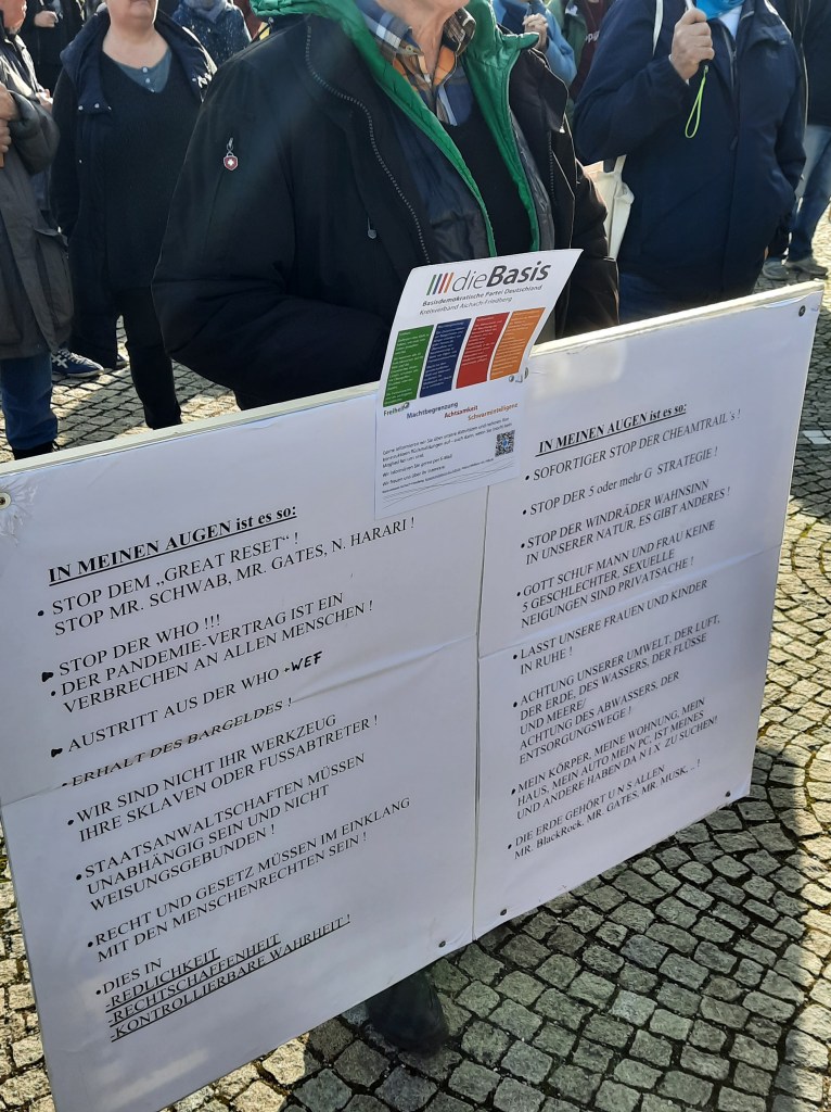 Verschwörungsideologische Inhalte finden sich auch anderweitig, so auf folgenden Plakaten, auf denen wahlweise vom „Great Reset“ „Globalismus“, „New World Order“ etc. die Rede ist, u. a. auf einem Plakat einer „Basis“-Anhängerin. Solche Inhalte implizieren eine jüdische Verschwörung und sind unserer Auffassung nach antisemitisch: