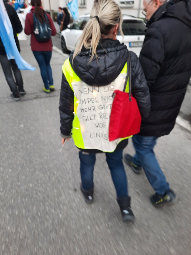 Fairerweise muss man sagen, dass hier nicht „rechts vor links“, sondern „RECHT VOR LINKS“ stand, was aber nichts an der grundsätzlichen Ablehnung der politischen Linken ändert, die hier offenbar mit der Ampelregierung identifiziert wird. Auch andere Teilnehmer*innen der Demo gehen offen mit ihrer Nähe zur extremen Rechten um: