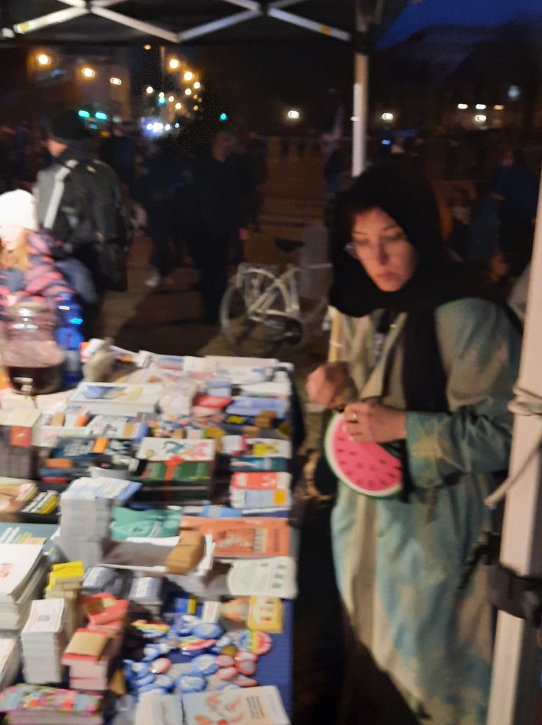 In dieser braunen Suppe aus Rechtsextremen, versprengten Linksradikalen, Russlandfans und Verschwörungsideolog*innen schwimmen nun auch unzählige Antizionist*innen, die sich wie Fische im Wasser fühlen. Erkennbar sind sie an palästinensischen Fahnen, Melonenschildern und Kufiya-Tüchern: