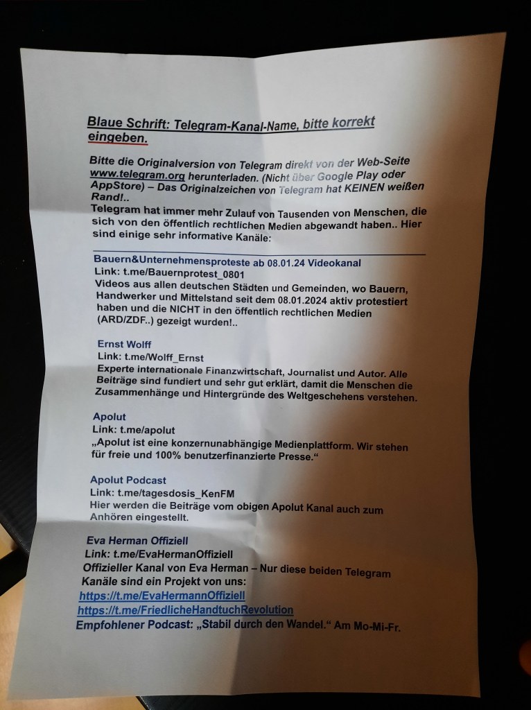 Auch die Beteiligung protestierender Bäuer*innen auf der Demo ist als Ausdruck eines mittelständischen Aufbegehrens zu deuten. Auf folgendem Flyer werden Medien empfohlen, die u. a. die „Bauern&Unternehmensproteste“ dokumentieren: