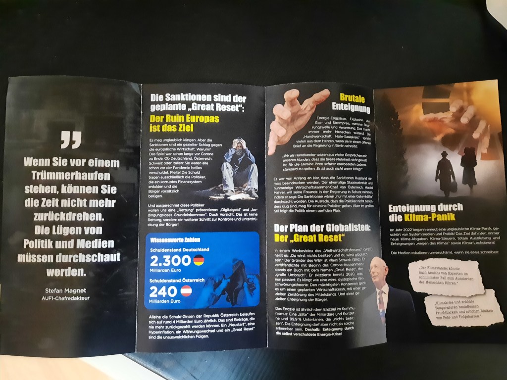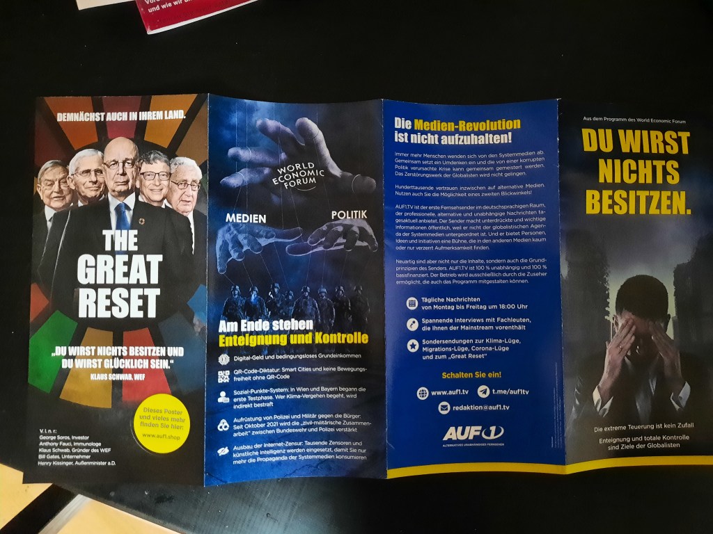 Dieser Flyer verbreitet die Verschwörungserzählung eines „Great Reset“, den politische Eliten, die „Globalisten“ – unter Beteiligung von den bekannten jüdischen US-Amerikanern George Soros und Henry Kissinger – planen würden, um mit der Inszenierung einer Pandemie oder einer Klimakrise den Mittelstand zu enteignen und die Weltherrschaft an sich zu reißen; als deren Ziel gilt eine „Neue Weltordnung“ (NWO). Der Ausdruck „Globalist“/“Globalismus“ ist übrigens eine Chiffre für eine jüdische Weltverschwörung, ebenso die NWO.[12]
