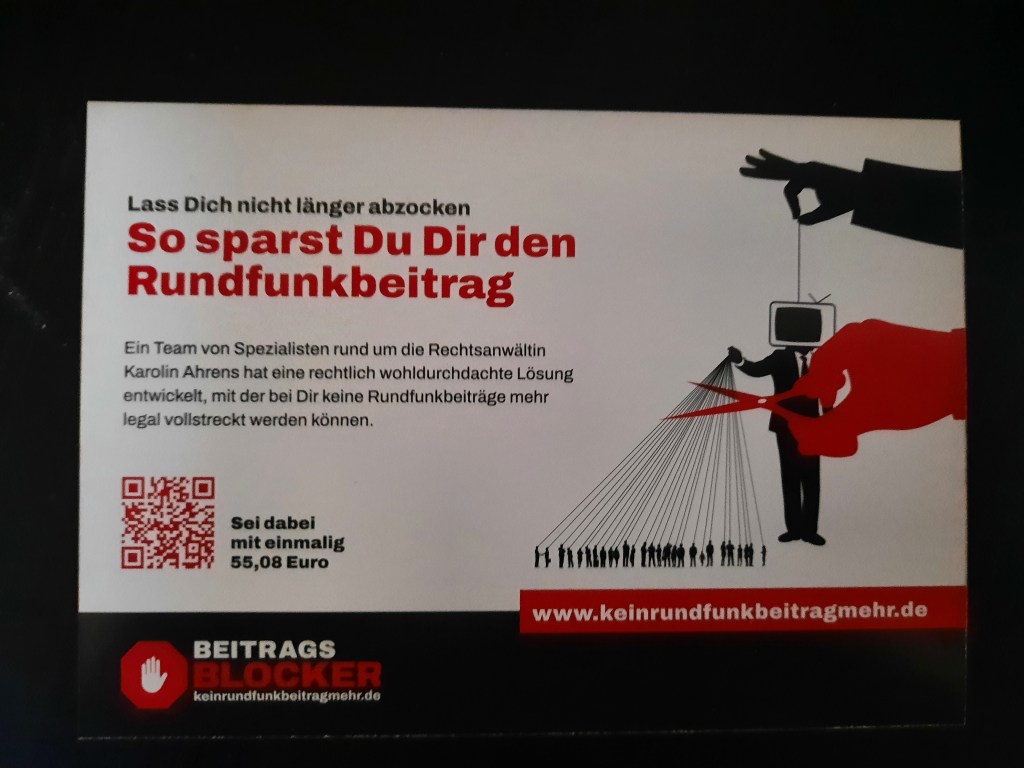 Die Marionettensymbolik, auch ein klassisches antisemitisches Motiv, findet sich auch auf einem Flyer, der sich gegen Rundfunkbeiträge wendet. Das ist im Kontext der grundsätzlichen Feindseligkeit der extremen Rechten gegenüber traditionellen Medien zu verstehen: