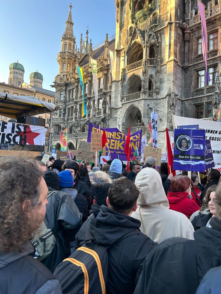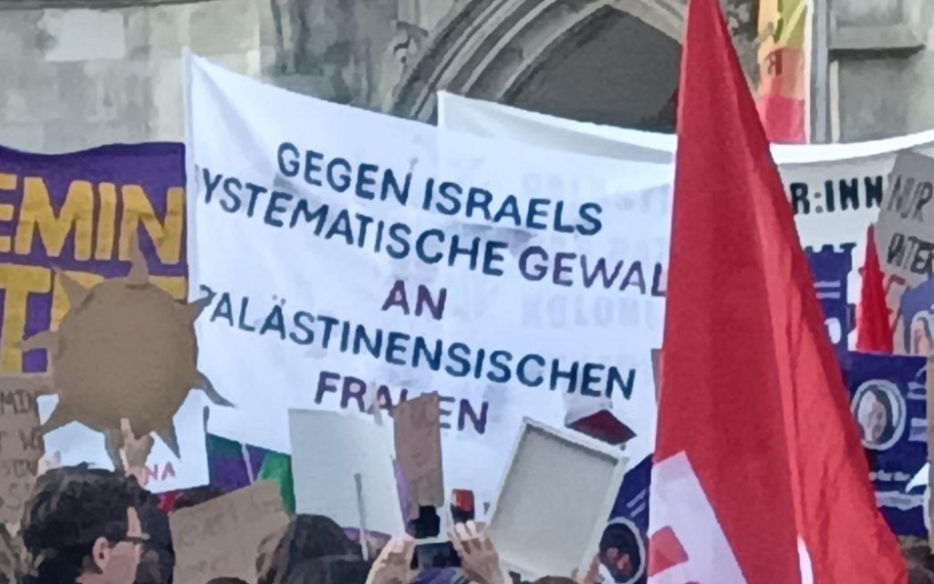 Wir kritisieren in aller Entschiedenheit, dass Klasse gegen Klasse und Palästina spricht – dazu mit diesen Inhalten – auf der Demo geduldet wurden. Im Kampf gegen das Patriarchat gilt es auch auf die sexualisierte Gewalt hinzuweisen, die die Hamas und ihre Unterstützer*innen bei ihrem Pogrom am 7. Oktober 2023 gegen israelische Frauen* und Mädchen* ausgeübt haben. Damals fanden Massenvergewaltigungen statt, wobei die meisten Betroffenen anschließend getötet wurden. Vor dem Hintergrund eine Organisation wie Palästina spricht, die diesen Pogrom offen zelebriert, auf einer feministischen Demonstration teilnehmen zu lassen – dazu mit Plakaten, auf denen Israel „systematische Gewalt an palästinensischen Frauen“ unterstellt wird – ist eine Verhöhnung der Opfer der Hamas, mehr noch: eine Herabwürdigung des feministischen Anliegens der gesamten Demo. Wir fordern die Orga dazu auf, diesen Vorfall aufzuarbeiten und dafür zu sorgen, dass er sich in Zukunft nicht wiederholen wird. Wer die Vergewaltigung von Frauen* und Kindern feiert, hat auf einer feministischen Demonstration schlicht nichts verloren.