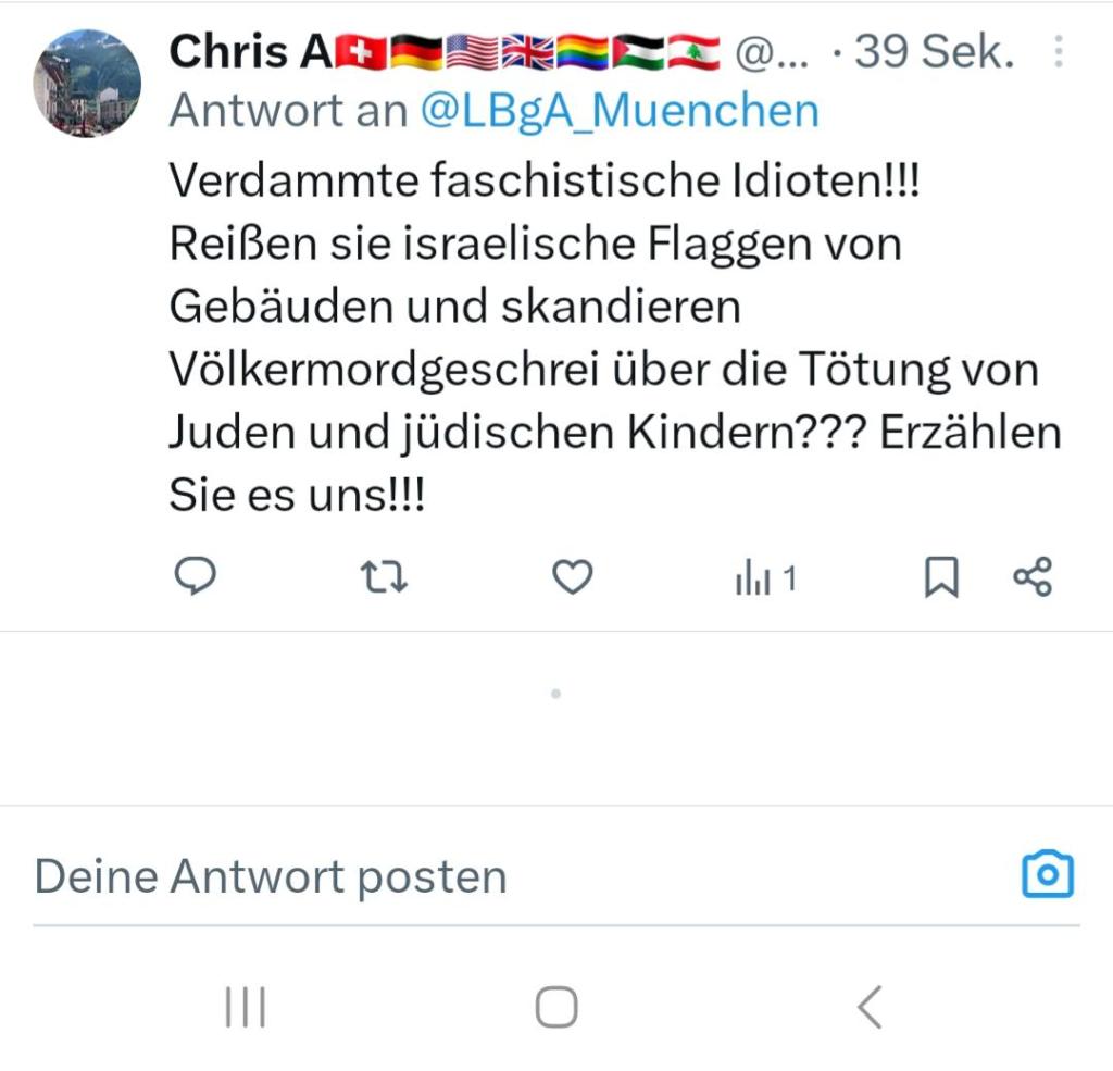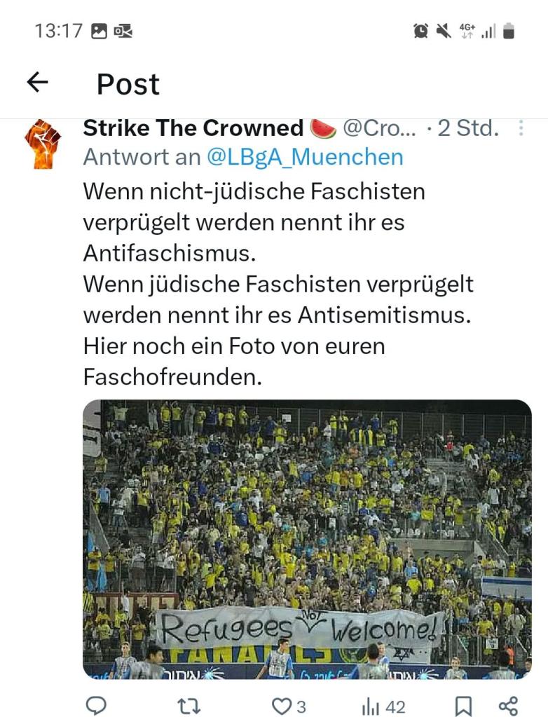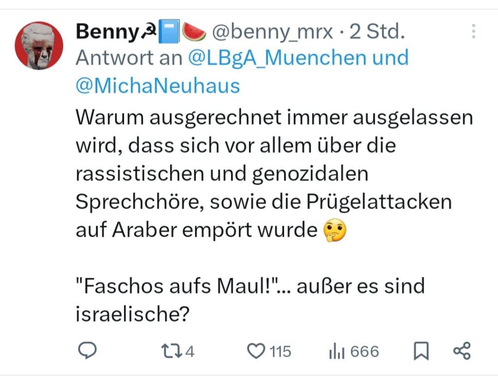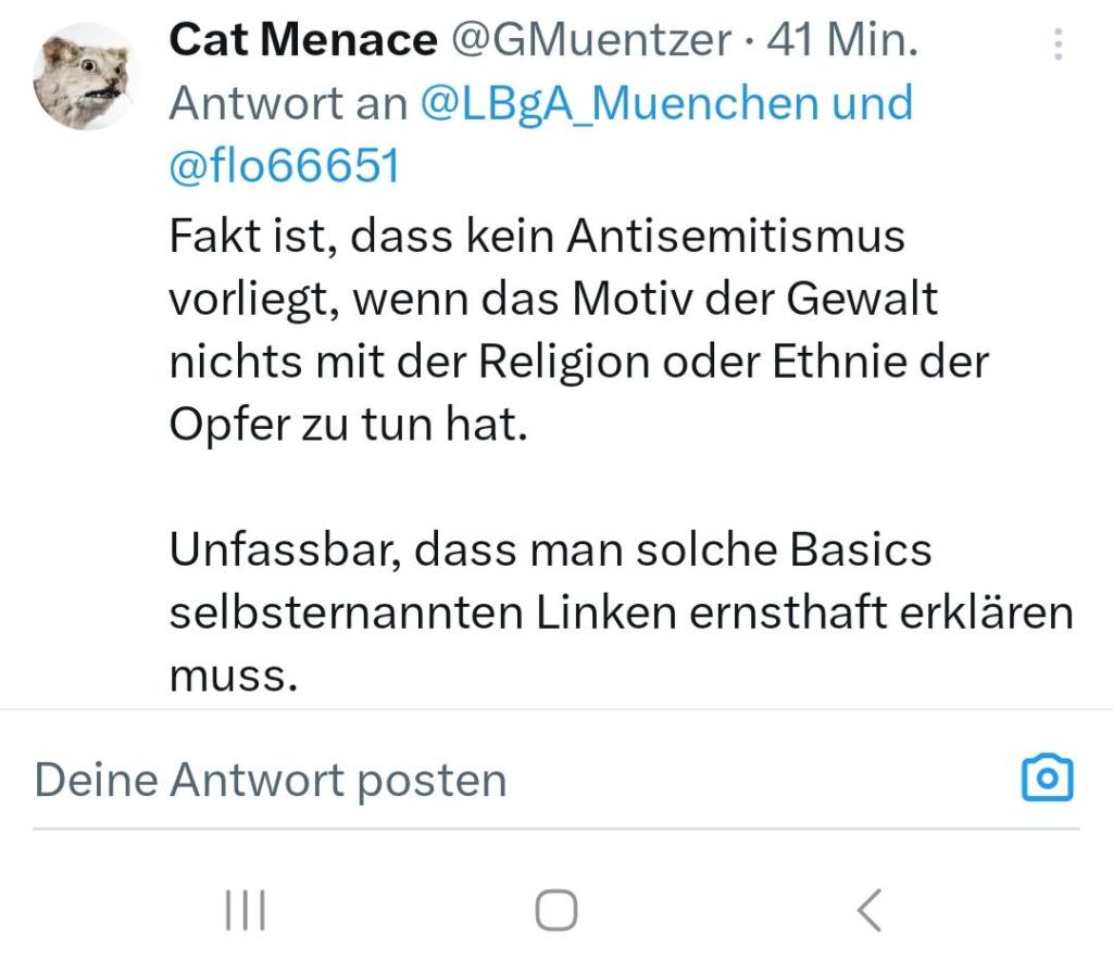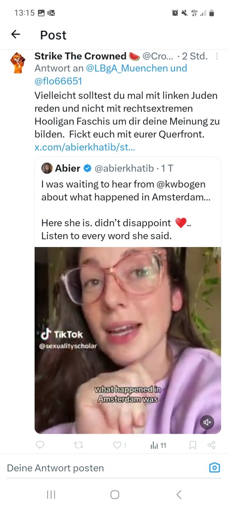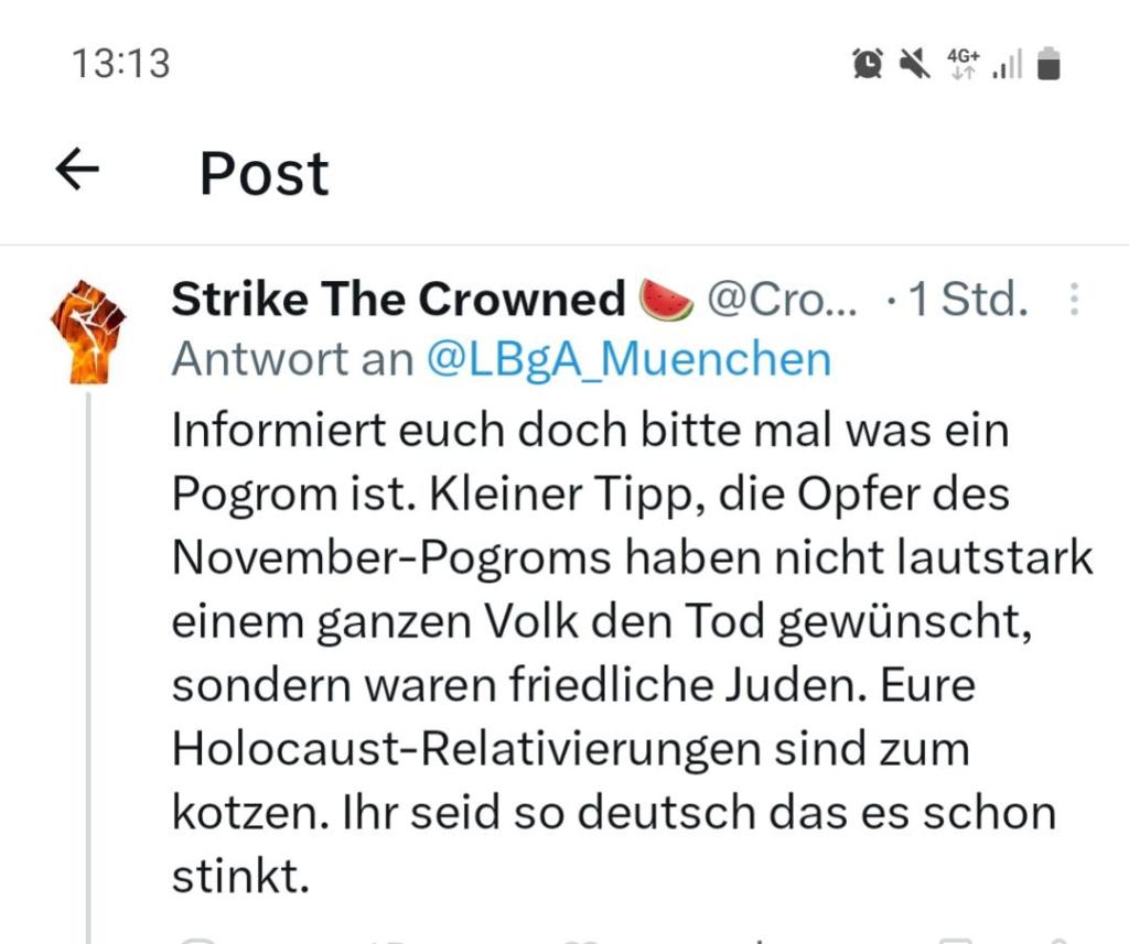 Soweit unsere Auswahl einschlägiger Kommentare auf Twitter. Allein die schiere Menge spricht für ein strukturelles Problem dieser Blase, die Kritik und Widerspruch nicht erträgt und mit Falschbehauptungen, Beschimpfungen und Gewaltfantasien kontert. Offenbar haben wir einen Nerv getroffen. Reaktionen dieser Art kannten wir bislang nur von Burschenschaften und Verschwörungsideolog*innen, also klar rechtsextremen Milieus. Gerade am und um den Jahrestag der Novemberpogrome zeigt sich darin eine eklatante Geschichtsvergessenheit. Ein Diskurs ist auch hier schlicht nicht möglich. Wer wie wir Gespräche mit Nazis kategorisch ausschließt, sollte genauso mit solchen Hamas-Sympathisant*innen verfahren.