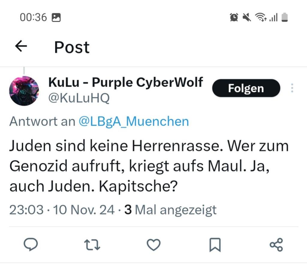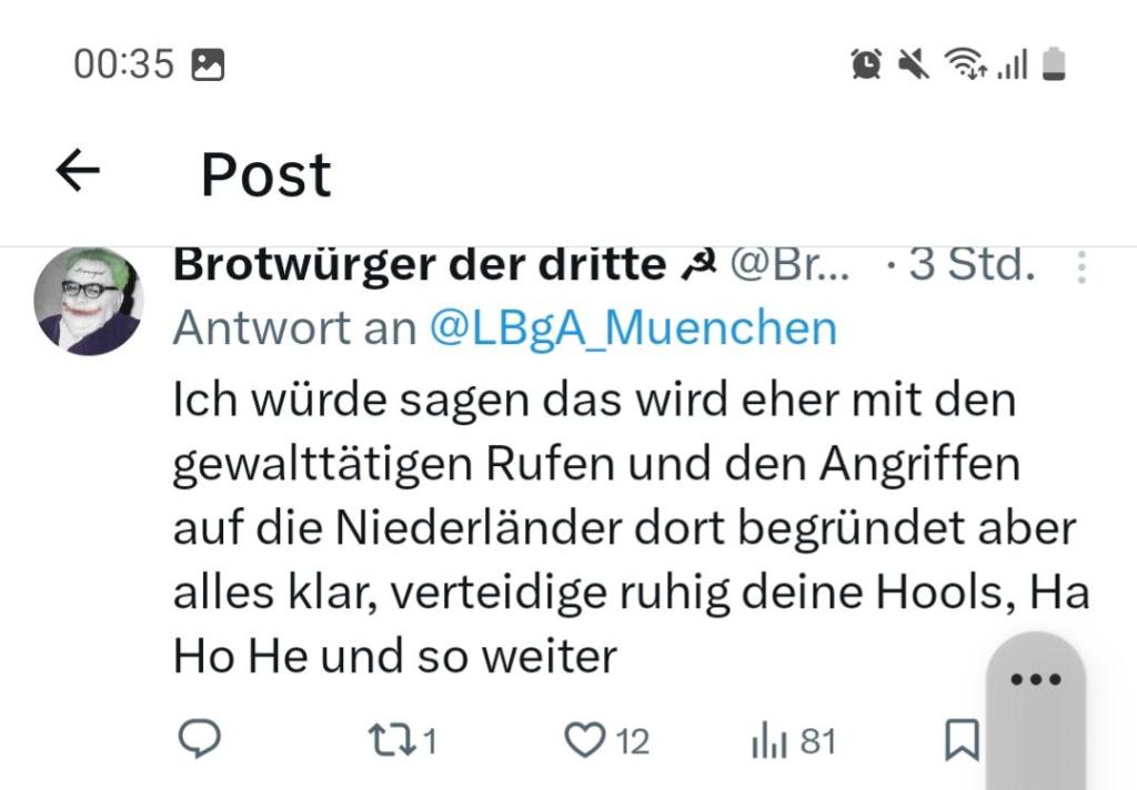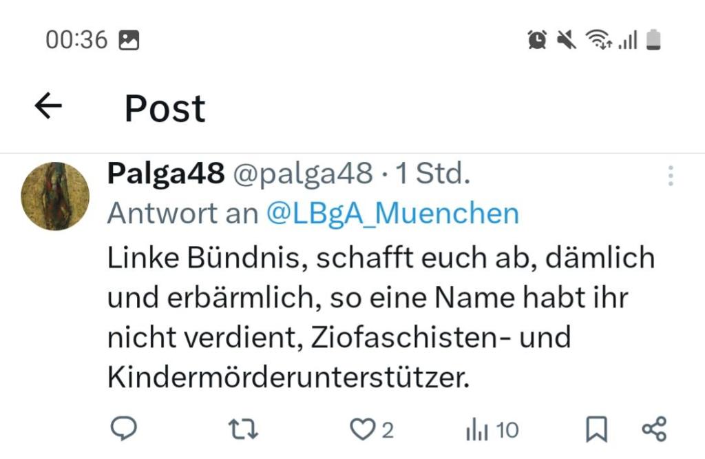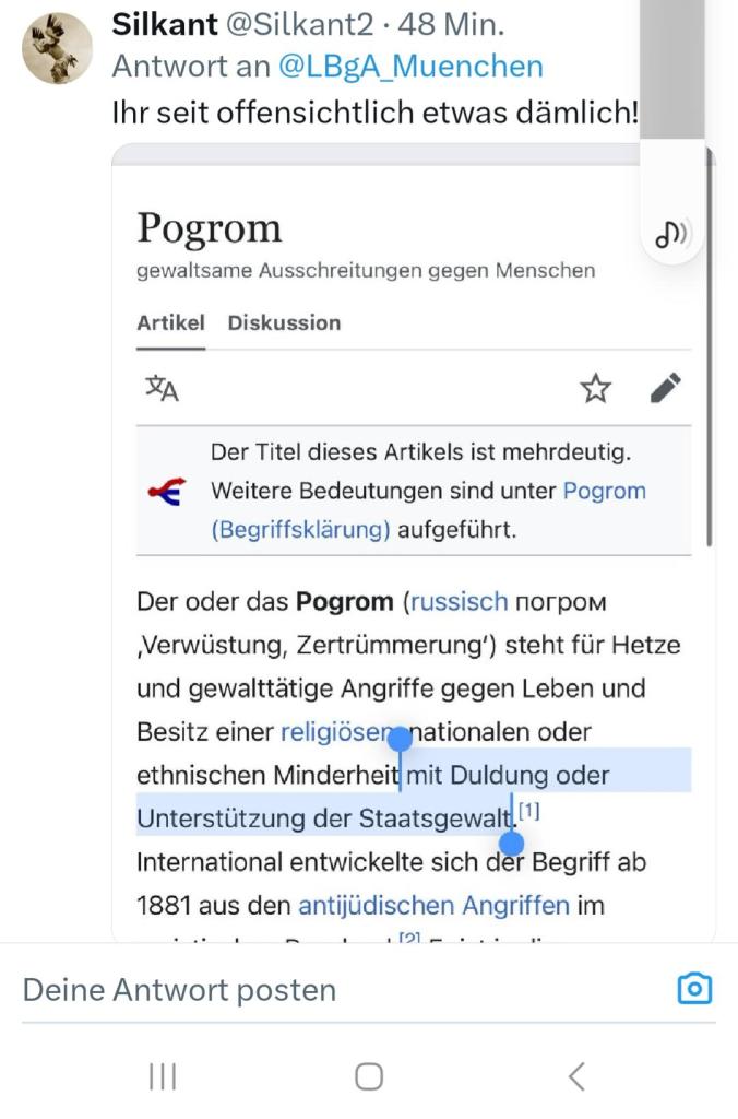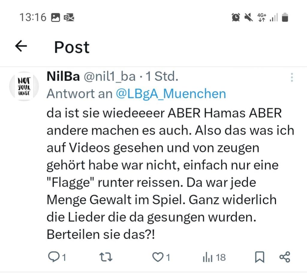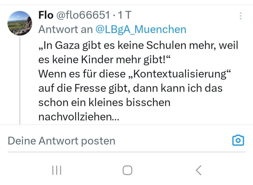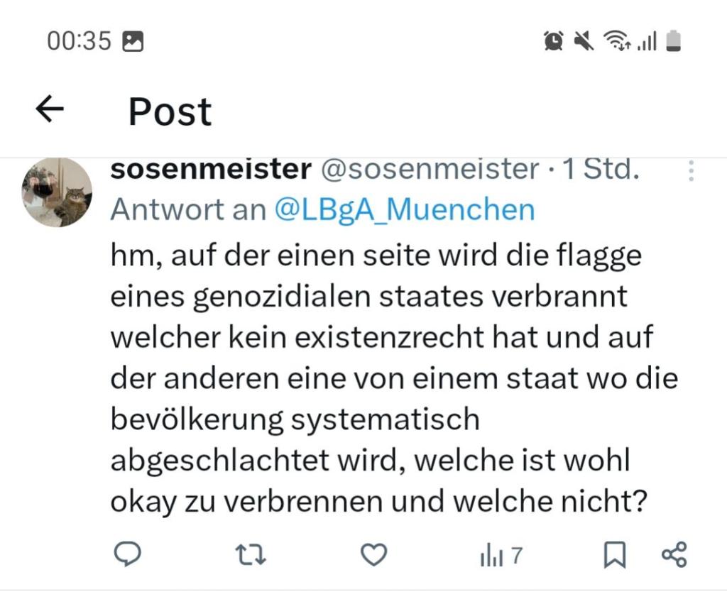 Soweit unsere Auswahl einschlägiger Kommentare auf Twitter. Allein die schiere Menge spricht für ein strukturelles Problem dieser Blase, die Kritik und Widerspruch nicht erträgt und mit Falschbehauptungen, Beschimpfungen und Gewaltfantasien kontert. Offenbar haben wir einen Nerv getroffen. Reaktionen dieser Art kannten wir bislang nur von Burschenschaften und Verschwörungsideolog*innen, also klar rechtsextremen Milieus. Gerade am und um den Jahrestag der Novemberpogrome zeigt sich darin eine eklatante Geschichtsvergessenheit. Ein Diskurs ist auch hier schlicht nicht möglich. Wer wie wir Gespräche mit Nazis kategorisch ausschließt, sollte genauso mit solchen Hamas-Sympathisant*innen verfahren.