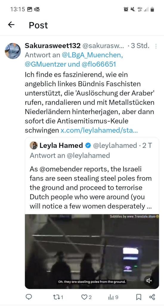 Zur Einordnung: In Deutschland werden durch mutmaßliche Hamas-Sympathisant*innen regelmäßig israelische Fahnen verbrannt, so auch nach 7/10 etwa in Augsburg, Düsseldorf, Hanau oder in verschiedenen Orten Baden-Württembergs, bisweilen auch auf ihren Demos. Ausschreitungen von Prozionist*innen sind dadurch keine ausgelöst worden. Auch nicht durch diffamierende Parolen wie „From the River to the Sea, Palestina will be free“, „Kindermörder Israel“ oder das 2014 sehr beliebte „Hamas, Hamas, Juden ins Gas“. Nicht einmal der signifikante Anstieg körperlicher Gewalt gegen Jüdinnen*Juden in Deutschland nach 7/10 hatte dergleichen zur Folge. Im Unterschied dazu führten rassistische Parolen, die Zerstörung palästinensischer Fahnen und der Angriff auf ein Taxi durch rechte Ultras des israelischen Fußballvereins Maccabi Tel Aviv zu einer Welle an Gewalt, der vielfach und zu Recht als Pogrom bezeichnet wurde: Jüdische Israelis wurden qua Ausweiskontrolle gezielt aufgespürt, durch Straßen gehetzt, vereinzelt getreten, überfahren, mit Feuerwerkskörpern beschmissen oder in einen Kanal geworfen – ganz egal, ob sie zu den Ultras zählten oder nicht. Bis zu 30 Menschen wurden verletzt. Noch in der Nacht auf Sonntag wurden Passant*innen nach Ausweisen gefragt und Jüdinnen*Juden bedroht. Da im Vorfeld israelische Behörden niederländische Sicherheitskräfte gewarnt hatten und die Angreifer sich in Telegram-Chats abgesprochen hatten, waren die Attacken womöglich schon länger geplant. Unserer Auffassung nach demonstriert diese Eskalation das große Gewaltpotential des antizionistischen Spektrums, für das es auf prozionistischer Seite kein Äquivalent gibt. Darauf wollten wir mit unserem Tweet hinweisen.