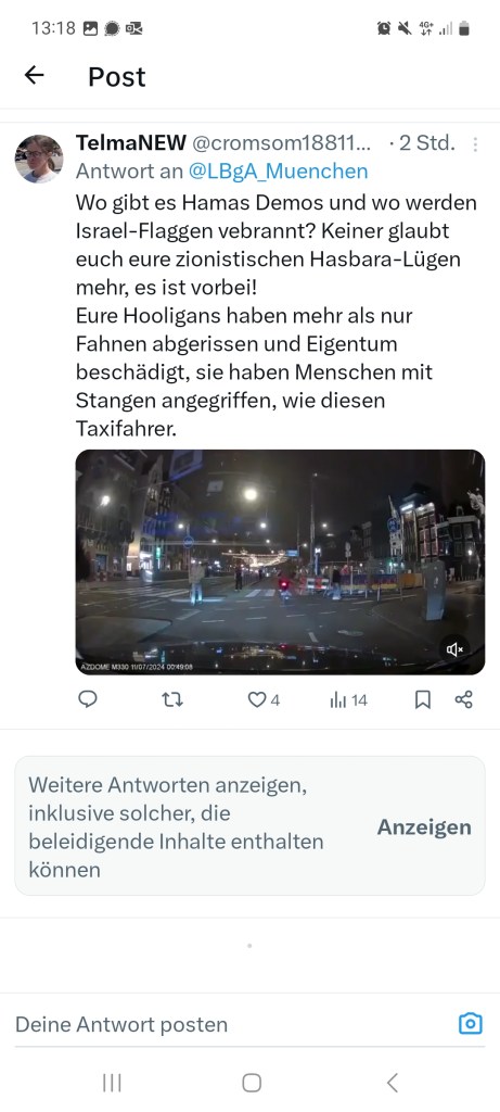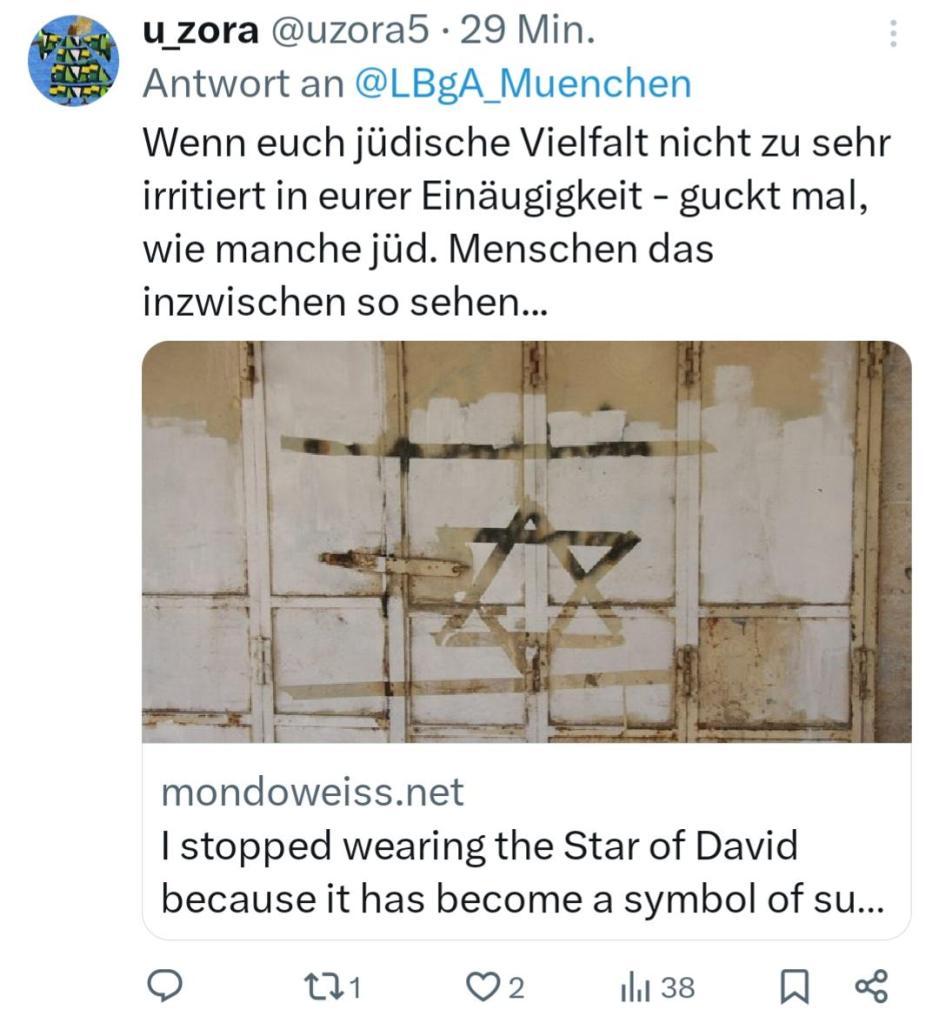 das ist ja schrecklich! vor allem, wenn es von accounts kommt, die sonst sehr auf correctness achten. eure frage war – ganz offen – die nach verhältnismässigkeit. wir kennen so eine diskussions-bereitschaft aus der querdenken-bubble, in die auch viele „linke“ abgedriftet sind. antisemitismus ist eine leidenschaft, die genau auf die abwehr von selbstreflektion abzielt (frei nach satre)