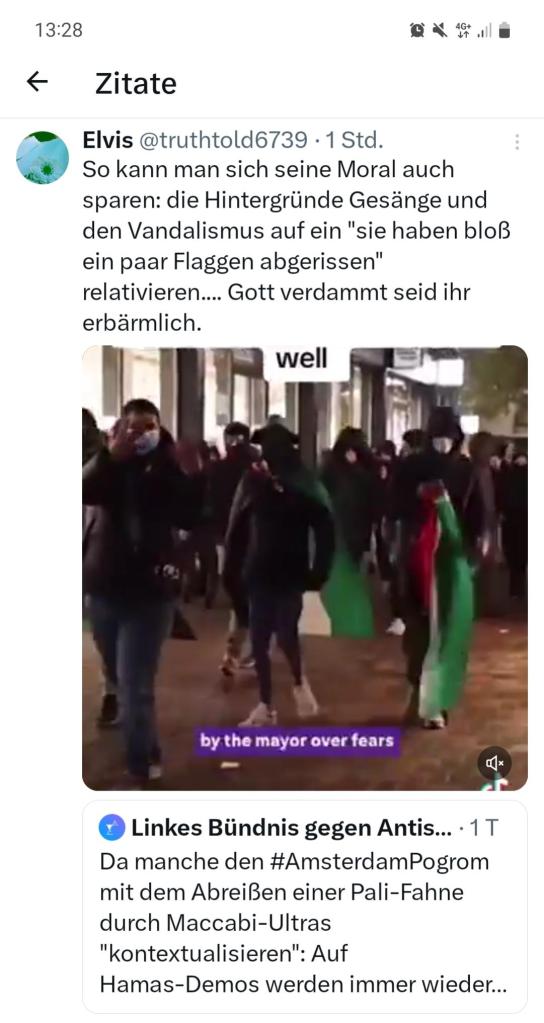 Da manche den #AmsterdamPogrom mit dem Abreißen einer Pali-Fahne durch Maccabi-Ultras „kontextualisieren“: Auf Hamas-Demos werden immer wieder Israel-Fahnen verbrannt, auch hierzulande. Niemand muss deswegen eine Hetzjagd befürchten. Kein*e Kontextualisierer*in prangert sowas an.